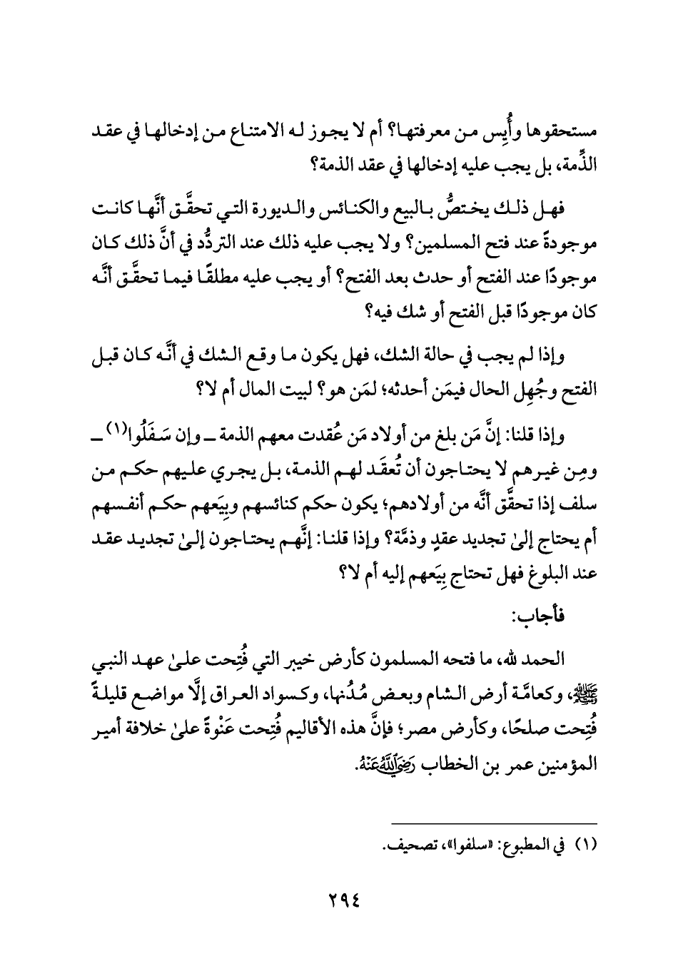 الحمد لله، ما فتحه المسلمون كأرض خيبر التي فُتِحت على عهد النبي - صلى الله عليه وسلم -، وكعامَّة أرض الشام وبعض مُدُنها، وكسواد العراق إلَّا مواضع قليلةً فُتِحت صلحًا، وكأرض مصر؛ فإنَّ هذه الأقاليم فُتِحت عَنْوةً على خلافة أمير المؤمنين عمر بن الخطاب - رضي الله عنه -.