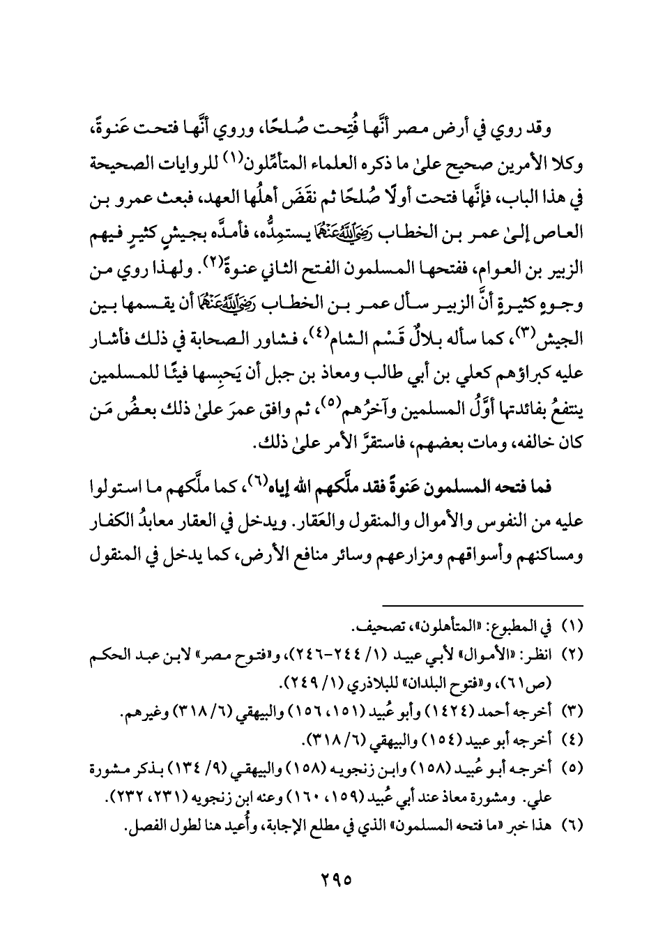 وقد روي في أرض مصر أنَّها فُتِحت صُلحًا، وروي أنَّها فتحت عَنوةً، وكلا الأمرين صحيح على ما ذكره العلماء المتأمِّلون (¬١) للروايات الصحيحة في هذا الباب، فإنَّها فتحت أولًا صُلحًا ثم نقَضَ أهلُها العهد، فبعث عمرو بن العاص إلى عمر بن الخطاب - رضي الله عنهما - يستمِدُّه، فأمدَّه بجيشٍ كثيرٍ فيهم الزبير بن العوام، ففتحها المسلمون الفتح الثاني عنوةً (¬٢). ولهذا روي من وجوهٍ كثيرةٍ أنَّ الزبير سأل عمر بن الخطاب - رضي الله عنهما - أن يقسمها بين الجيش (¬٣)، كما سأله بلالٌ قَسْم الشام (¬٤)، فشاور الصحابة في ذلك فأشار عليه كبراؤهم كعلي بن أبي طالب ومعاذ بن جبل أن يَحبِسها فيئًا للمسلمين ينتفعُ بفائدتها أوَّلُ المسلمين وآخرُهم (¬٥)، ثم وافق عمرَ على ذلك بعضُ مَن كان خالفه، ومات بعضهم، فاستقرَّ الأمر على ذلك.