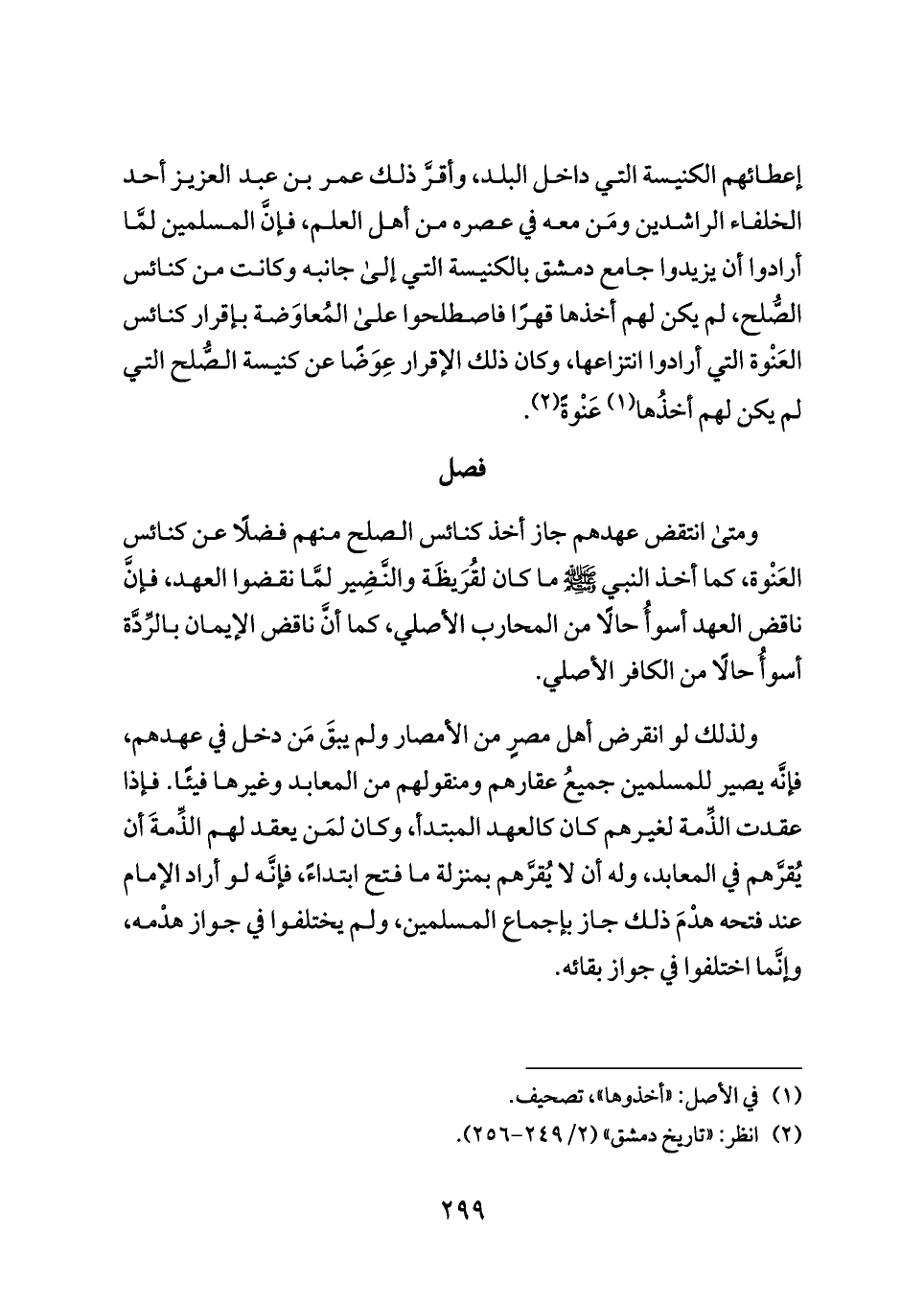 إعطائهم الكنيسة التي داخل البلد، وأقرَّ ذلك عمر بن عبد العزيز أحد الخلفاء الراشدين ومَن معه في عصره من أهل العلم، فإنَّ المسلمين لمَّا أرادوا أن يزيدوا جامع دمشق بالكنيسة التي إلى جانبه وكانت من كنائس الصُّلح، لم يكن لهم أخذها قهرًا فاصطلحوا على المُعاوَضة بإقرار كنائس العَنْوة التي أرادوا انتزاعها، وكان ذلك الإقرار عِوَضًا عن كنيسة الصُّلح التي لم يكن لهم أخذُها (¬١) عَنْوةً (¬٢).