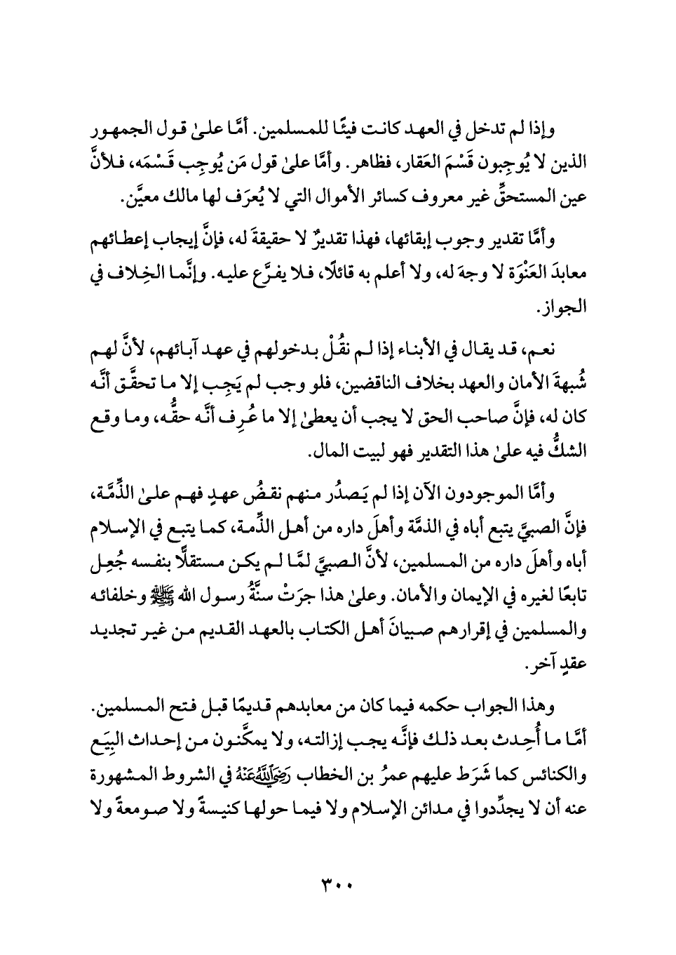 وأمَّا الموجودون الآن إذا لم يَصدُر منهم نقضُ عهدٍ فهم على الذِّمَّة، فإنَّ الصبيَّ يتبع أباه في الذمَّة وأهلَ داره من أهل الذِّمة، كما يتبع في الإسلام أباه وأهلَ داره من المسلمين، لأنَّ الصبيَّ لمَّا لم يكن مستقلًّا بنفسه جُعِل تابعًا لغيره في الإيمان والأمان. وعلى هذا جرَتْ سنَّةُ رسول الله - صلى الله عليه وسلم - وخلفائه والمسلمين في إقرارهم صبيانَ أهل الكتاب بالعهد القديم من غير تجديد عقدٍ آخر.