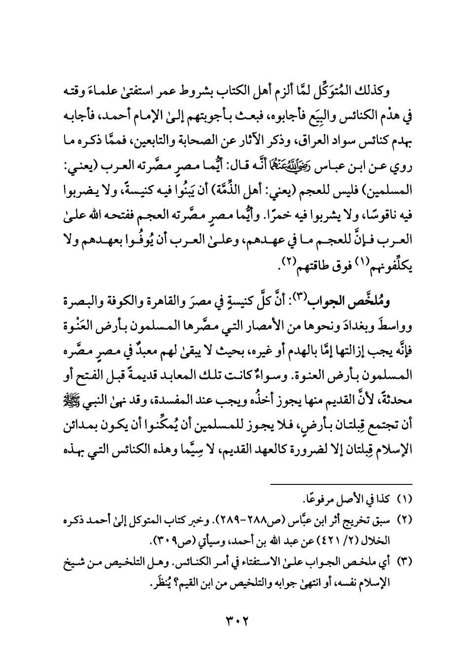 وكذلك المُتوَكِّل لمَّا ألزم أهل الكتاب بشروط عمر استفتى علماءَ وقته في هدْم الكنائس والبِيَع فأجابوه، فبعث بأجوبتهم إلى الإمام أحمد، فأجابه بهدم كنائس سواد العراق، وذكر الآثار عن الصحابة والتابعين، فممَّا ذكره ما روي عن ابن عباس - رضي الله عنهما - أنَّه قال: أيُّما مصرٍ مصَّرته العرب (يعني: المسلمين) فليس للعجم (يعني: أهل الذِّمَّة) أن يَبنُوا فيه كنيسةً، ولا يضربوا فيه ناقوسًا، ولا يشربوا فيه خمرًا. وأيُّما مصرٍ مصَّرته العجم ففتحه الله على العرب فإنَّ للعجم ما في عهدهم، وعلى العرب أن يُوفُوا بعهدهم ولا يكلِّفونهم (¬١) فوق طاقتهم (¬٢).