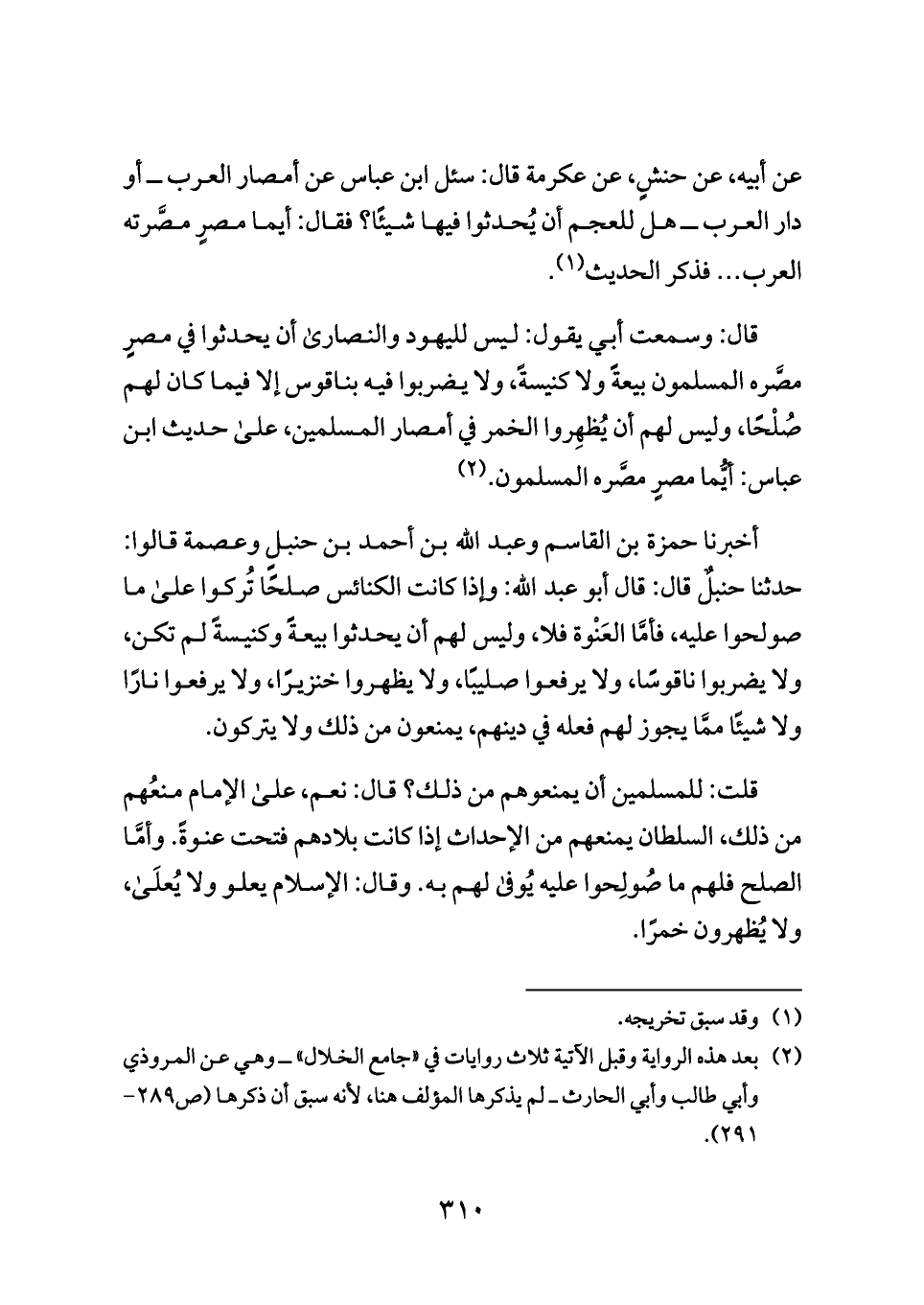أخبرنا حمزة بن القاسم وعبد الله بن أحمد بن حنبلٍ وعصمة قالوا: حدثنا حنبلٌ قال: قال أبو عبد الله: وإذا كانت الكنائس صلحًا تُركوا على ما صولحوا عليه، فأمَّا العَنْوة فلا، وليس لهم أن يحدثوا بيعةً وكنيسةً لم تكن، ولا يضربوا ناقوسًا، ولا يرفعوا صليبًا، ولا يظهروا خنزيرًا، ولا يرفعوا نارًا ولا شيئًا ممَّا يجوز لهم فعله في دينهم، يمنعون من ذلك ولا يتركون.