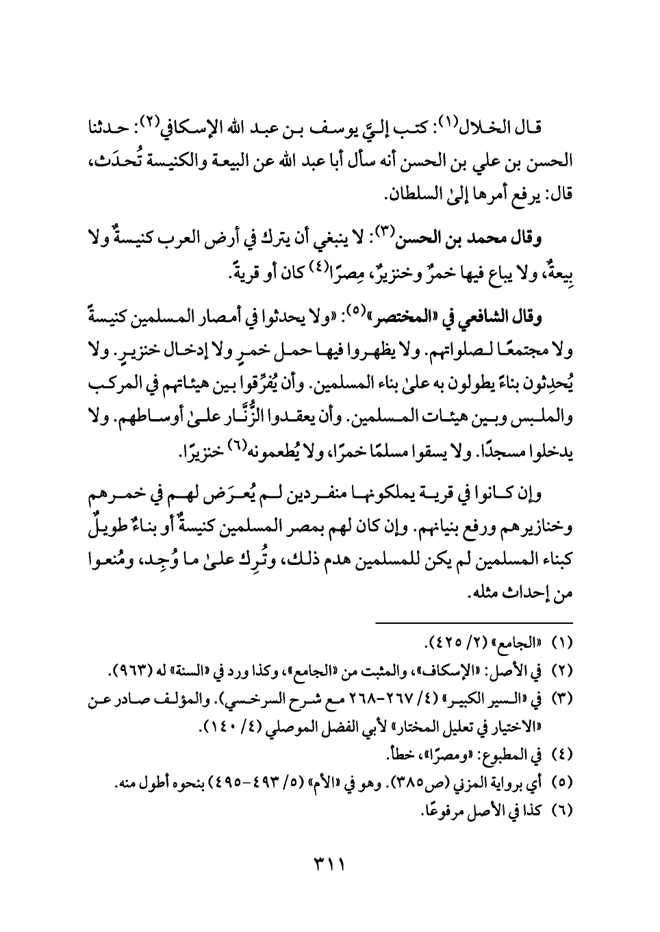 وقال الشافعي في «المختصر» (¬٥): «ولا يحدثوا في أمصار المسلمين كنيسةً ولا مجتمعًا لصلواتهم. ولا يظهروا فيها حمل خمرٍ ولا إدخال خنزيرٍ. ولا يُحدِثون بناءً يطولون به على بناء المسلمين. وأن يُفرِّقوا بين هيئاتهم في المركب والملبس وبين هيئات المسلمين. وأن يعقدوا الزُّنَّار على أوساطهم. ولا يدخلوا مسجدًا. ولا يسقوا مسلمًا خمرًا، ولا يُطعمونه (¬٦) خنزيرًا.