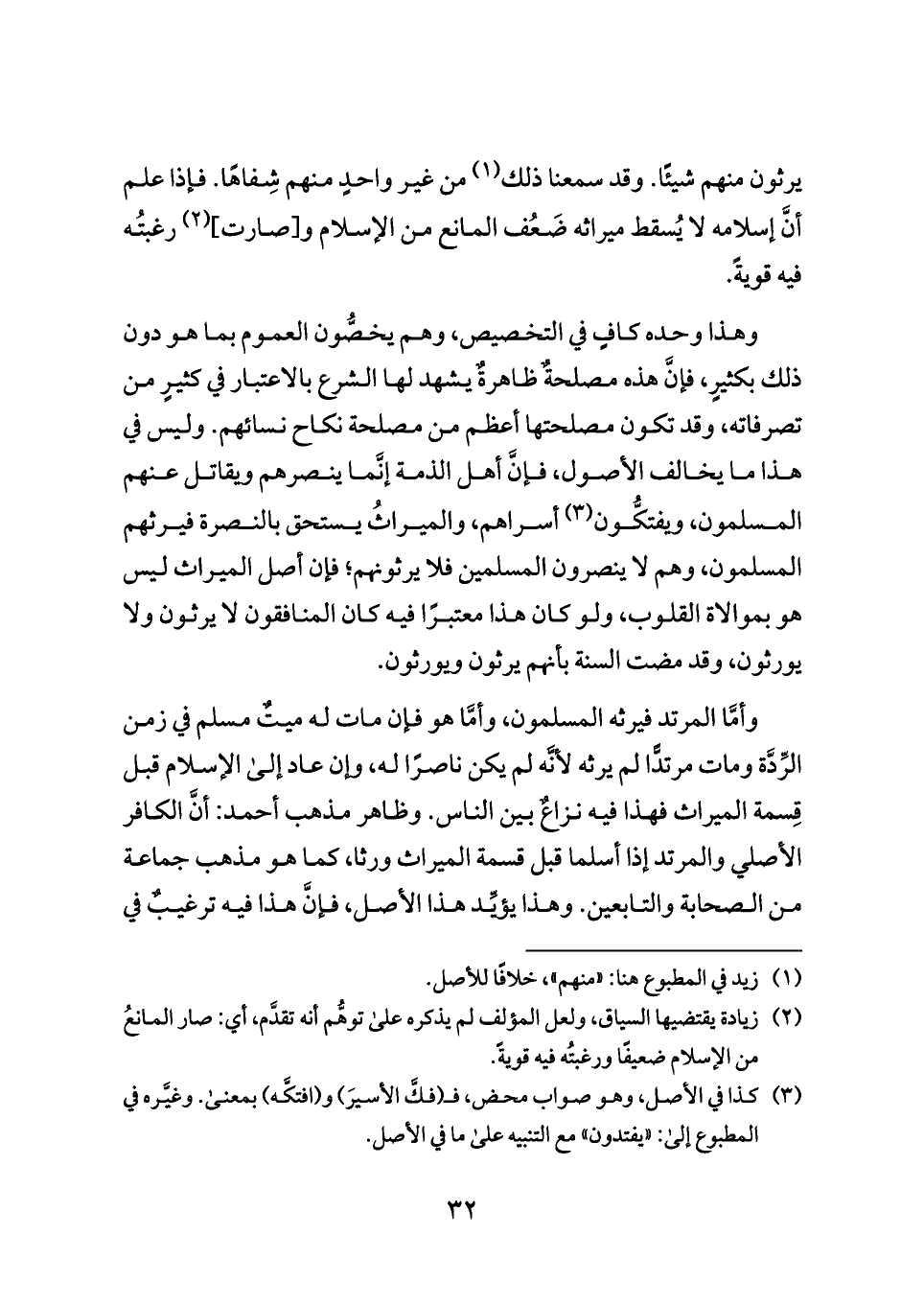 وأمَّا المرتد فيرثه المسلمون، وأمَّا هو فإن مات له ميتٌ مسلم في زمن الرِّدَّة ومات مرتدًّا لم يرثه لأنَّه لم يكن ناصرًا له، وإن عاد إلى الإسلام قبل قِسمة الميراث فهذا فيه نزاعٌ بين الناس. وظاهر مذهب أحمد: أنَّ الكافر الأصلي والمرتد إذا أسلما قبل قسمة الميراث ورثا، كما هو مذهب جماعة من الصحابة والتابعين. وهذا يؤيِّد هذا الأصل، فإنَّ هذا فيه ترغيبٌ في