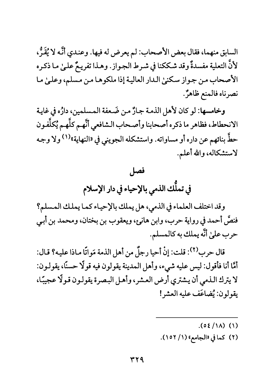 قال حرب (¬٢): قلت: إنْ أحيا رجلٌ من أهل الذمة مَواتًا ماذا عليه؟ قال: أمَّا أنا فأقول: ليس عليه شيء، وأهل المدينة يقولون فيه قولًا حسنًا، يقولون: لا يترك الذمي أن يشتري أرض العشر، وأهل البصرة يقولون قولًا عجيبًا، يقولون: يُضاعَف عليه العشر!