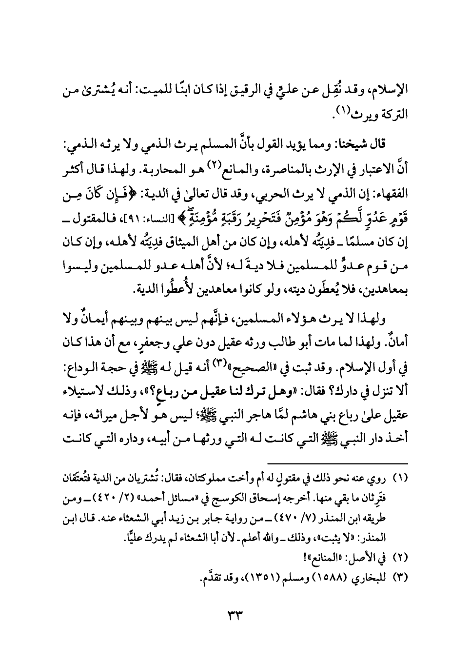 ولهذا لا يرث هؤلاء المسلمين، فإنَّهم ليس بينهم وبينهم أيمانٌ ولا أمانٌ. ولهذا لما مات أبو طالب ورثه عقيل دون علي وجعفرٍ، مع أن هذا كان في أول الإسلام. وقد ثبت في «الصحيح» (¬٣) أنه قيل له - صلى الله عليه وسلم - في حجة الوداع: ألا تنزل في دارك؟ فقال: «وهل ترك لنا عقيل من رباعٍ؟»، وذلك لاستيلاء عقيل على رباع بني هاشم لمَّا هاجر النبي - صلى الله عليه وسلم -؛ ليس هو لأجل ميراثه، فإنه أخذ دار النبي - صلى الله عليه وسلم - التي كانت له التي ورثها من أبيه، وداره التي كانت