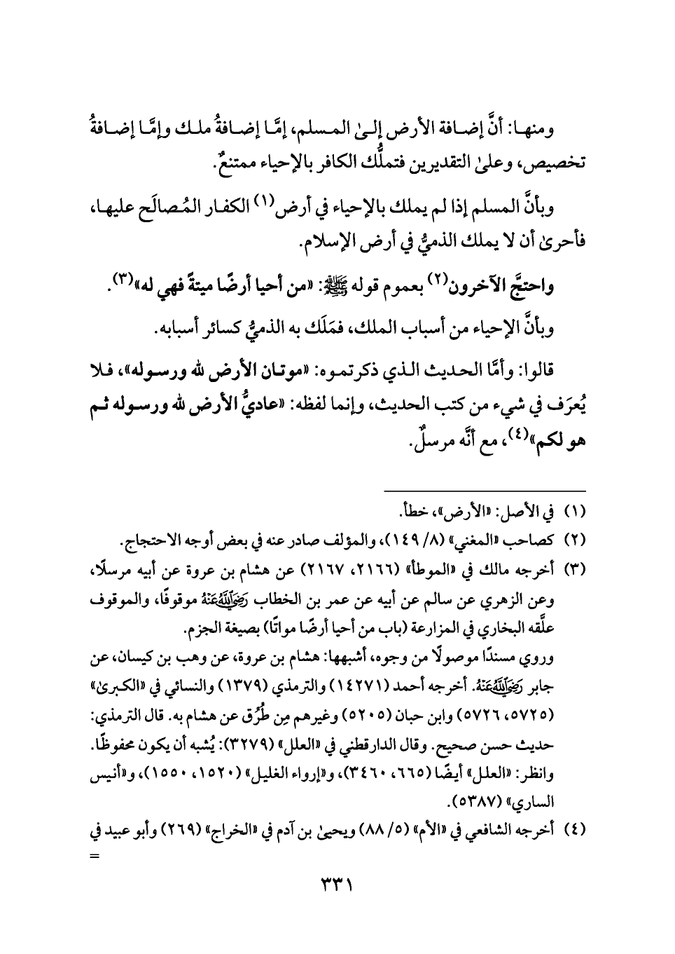 ومنها: أنَّ إضافة الأرض إلى المسلم، إمَّا إضافةُ ملك وإمَّا إضافةُ تخصيص، وعلى التقديرين فتملُّك الكافر بالإحياء ممتنعٌ.