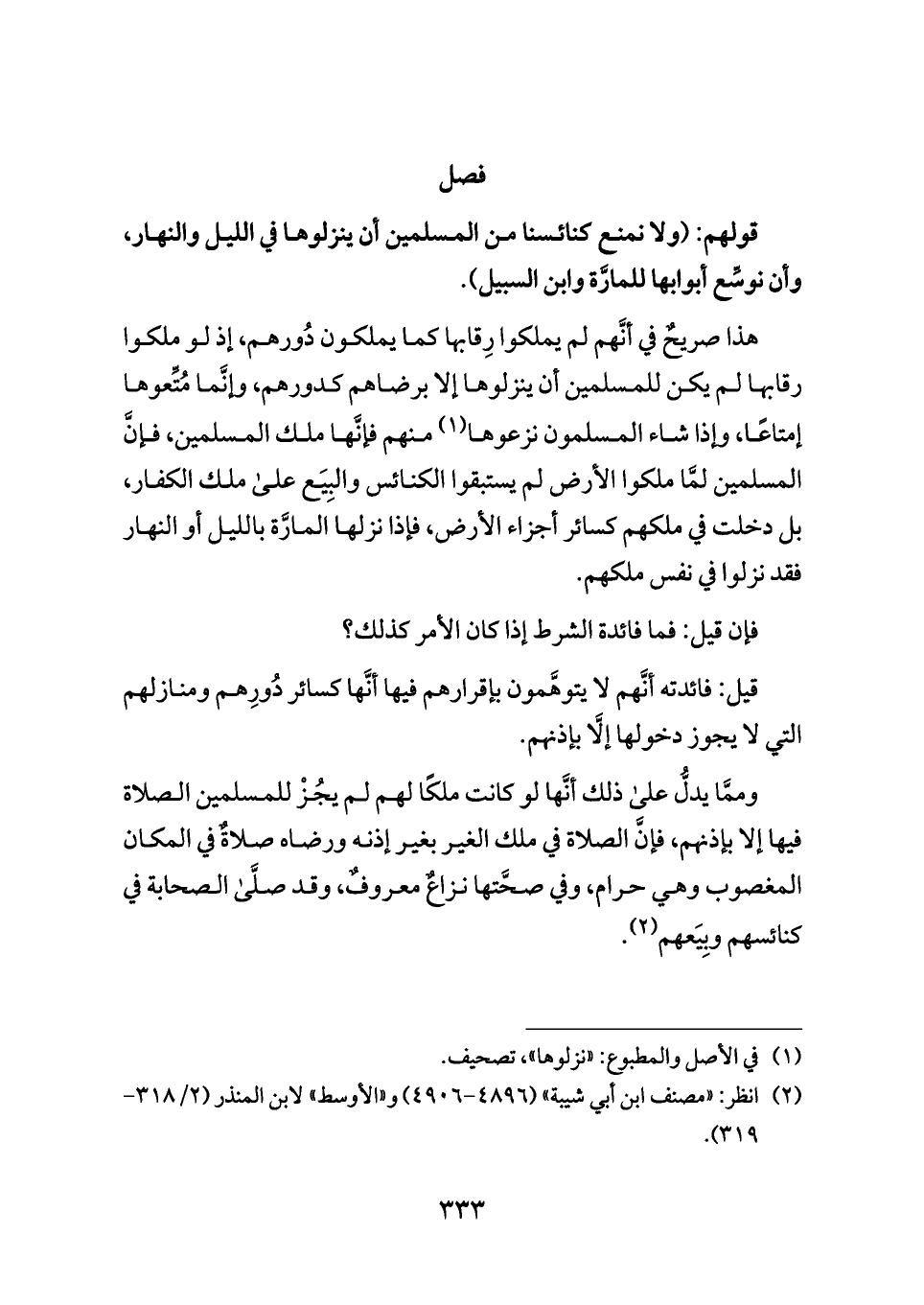 وممَّا يدلُّ على ذلك أنَّها لو كانت ملكًا لهم لم يجُزْ للمسلمين الصلاة فيها إلا بإذنهم، فإنَّ الصلاة في ملك الغير بغير إذنه ورضاه صلاةٌ في المكان المغصوب وهي حرام، وفي صحَّتها نزاعٌ معروفٌ، وقد صلَّى الصحابة في كنائسهم وبِيَعهم (¬٢).