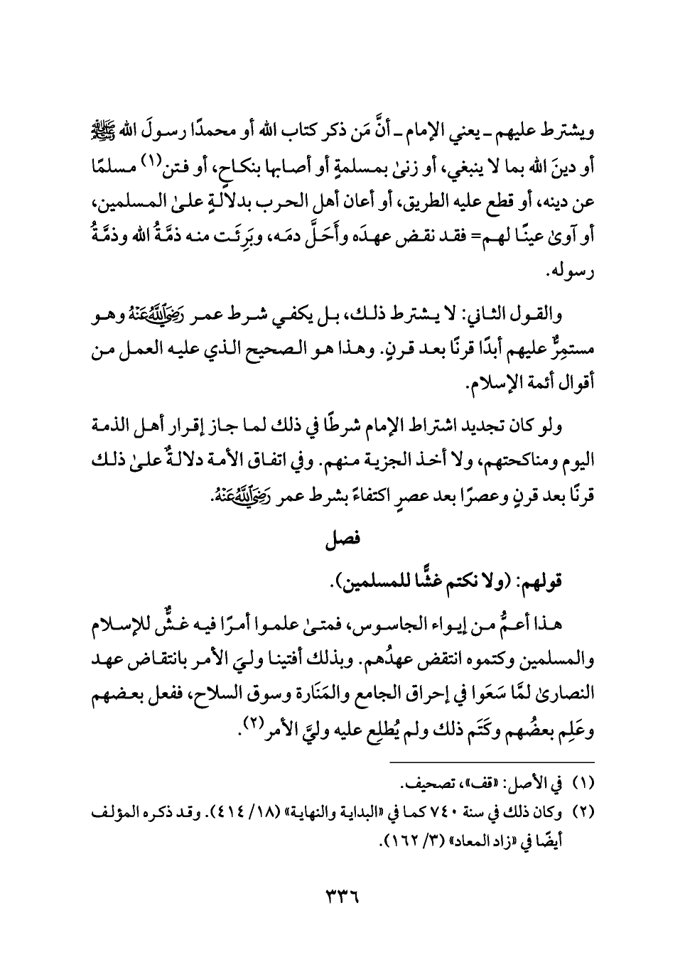 ولو كان تجديد اشتراط الإمام شرطًا في ذلك لما جاز إقرار أهل الذمة اليوم ومناكحتهم، ولا أخذ الجزية منهم. وفي اتفاق الأمة دلالةٌ على ذلك قرنًا بعد قرنٍ وعصرًا بعد عصرٍ اكتفاءً بشرط عمر - رضي الله عنه -.