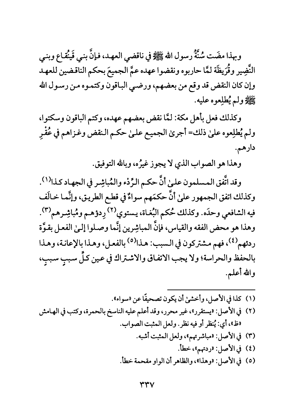 وبهذا مضَت سُنَّةُ رسول الله - صلى الله عليه وسلم - في ناقضي العهد، فإنَّ بني قَينُقاع وبني النَّضِير وقُرَيظَة لمَّا حاربوه ونقضوا عهده عمَّ الجميعَ بحكم الناقضين للعهد وإن كان النقض قد وقع من بعضهم، ورضي الباقون وكتموه من رسول الله - صلى الله عليه وسلم - ولم يُطلِعوه عليه.