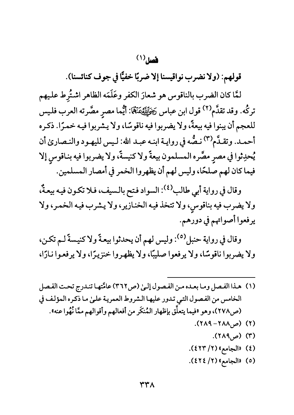(¬١) هذا الفصل وما بعده من الفصول إلى (ص ٣٦٢) عامَّتها تندرج تحت الفصل الخامس من الفصول التي تدور عليها الشروط العمرية على ما ذكره المؤلف في (ص ٢٧٨)، وهو «فيما يتعلَّق بإظهار المُنكَر من أفعالهم وأقوالهم ممَّا نُهُوا عنه».