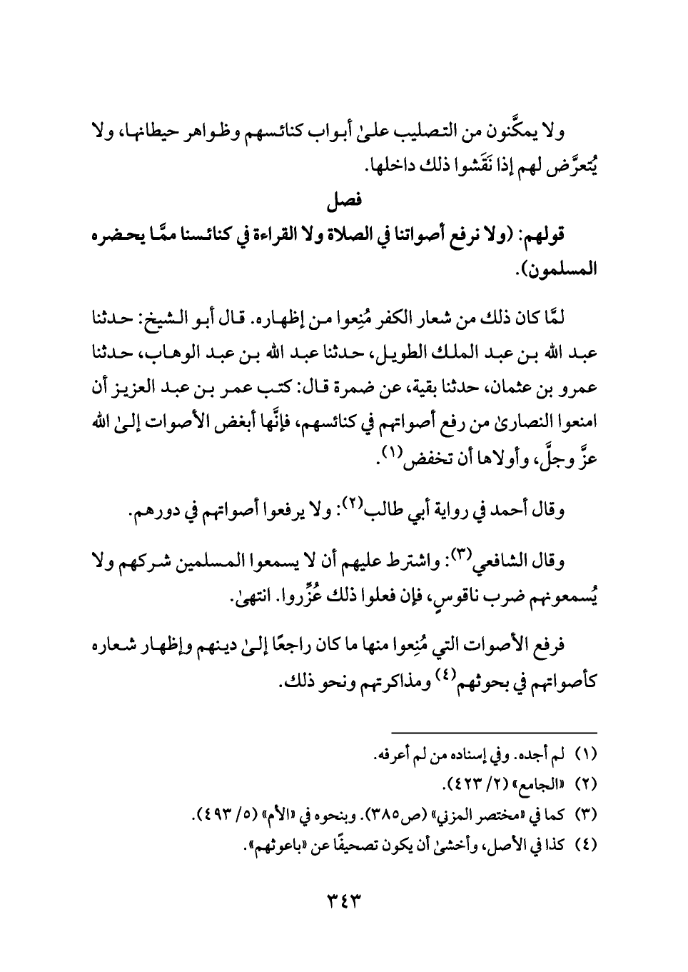 قولهم: (ولا نرفع أصواتنا في الصلاة ولا القراءة في كنائسنا ممَّا يحضره المسلمون).