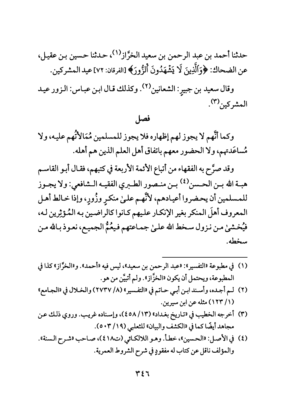 (¬٤) في الأصل: «الحسين»، خطأ. وهو اللالكائي (ت ٤١٨)، صاحب «شرح السنة». والمؤلف ناقل عن كتاب له مفقودٍ في شرح الشروط العمرية.