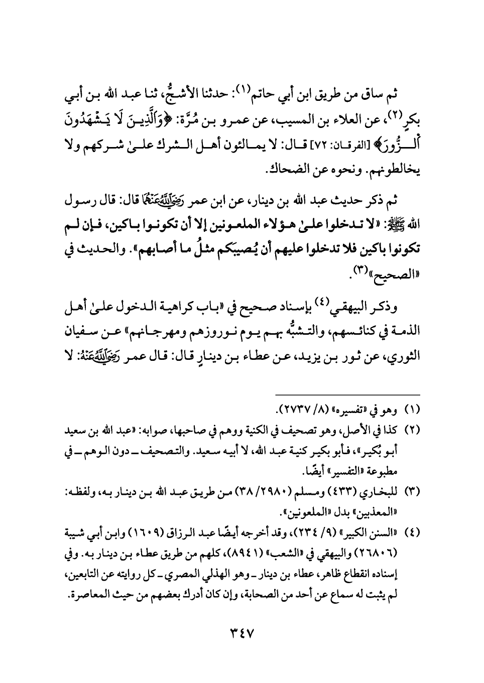 ثم ساق من طريق ابن أبي حاتم (¬١): حدثنا الأشجُّ، ثنا عبد الله بن أبي بكرٍ (¬٢)، عن العلاء بن المسيب، عن عمرو بن مُرَّة: {وَاَلَّذِينَ لَا يَشْهَدُونَ اَلزُّورَ} [الفرقان: ٧٢] قال: لا يمالئون أهل الشرك على شركهم ولا يخالطونهم. ونحوه عن الضحاك.