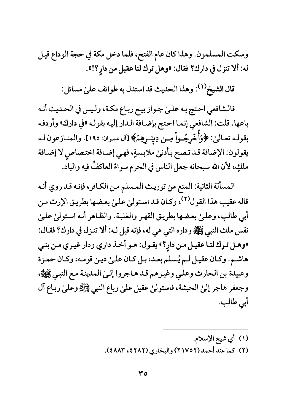 فالشافعي احتج به على جواز بيع رباع مكة، وليس في الحديث أنه باعها. قلت: الشافعي إنما احتج بإضافة الدار إليه بقوله «في دارك» وأردفه بقوله تعالى: {وَأُخْرِجُوا مِن دِيَارِهِمْ} [آل عمران: ١٩٥]. والمنازعون له يقولون: الإضافة قد تصح بأدنى ملابسةٍ، فهي إضافة اختصاصٍ لا إضافة ملكٍ، لأن الله سبحانه جعل الناس في الحرم سواءً العاكفُ فيه والباد.