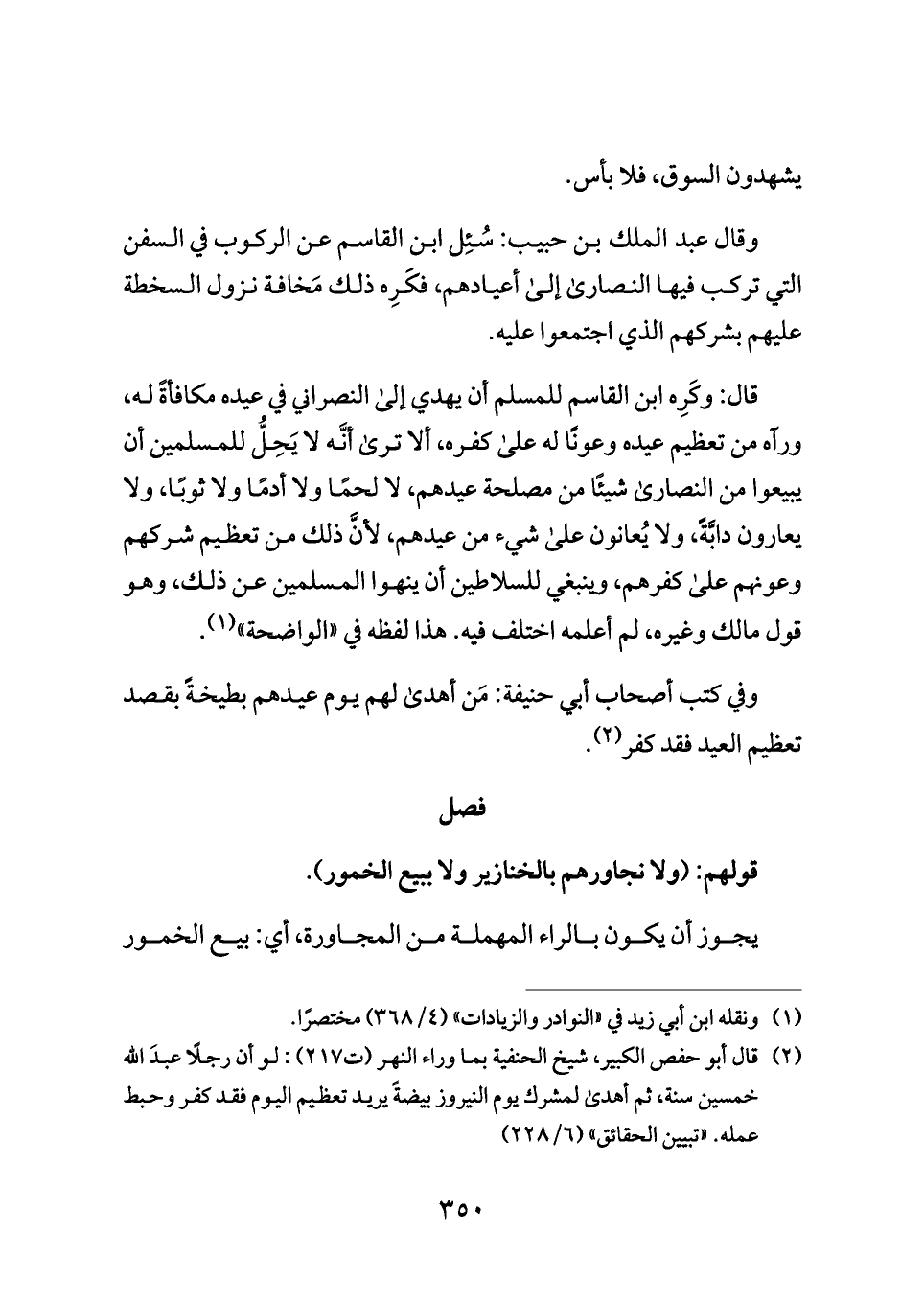 قال: وكَرِه ابن القاسم للمسلم أن يهدي إلى النصراني في عيده مكافأةً له، ورآه من تعظيم عيده وعونًا له على كفره، ألا ترى أنَّه لا يَحِلُّ للمسلمين أن يبيعوا من النصارى شيئًا من مصلحة عيدهم، لا لحمًا ولا أدمًا ولا ثوبًا، ولا يعارون دابَّةً، ولا يُعانون على شيء من عيدهم، لأنَّ ذلك من تعظيم شركهم وعونهم على كفرهم، وينبغي للسلاطين أن ينهوا المسلمين عن ذلك، وهو قول مالك وغيره، لم أعلمه اختلف فيه. هذا لفظه في «الواضحة» (¬١).