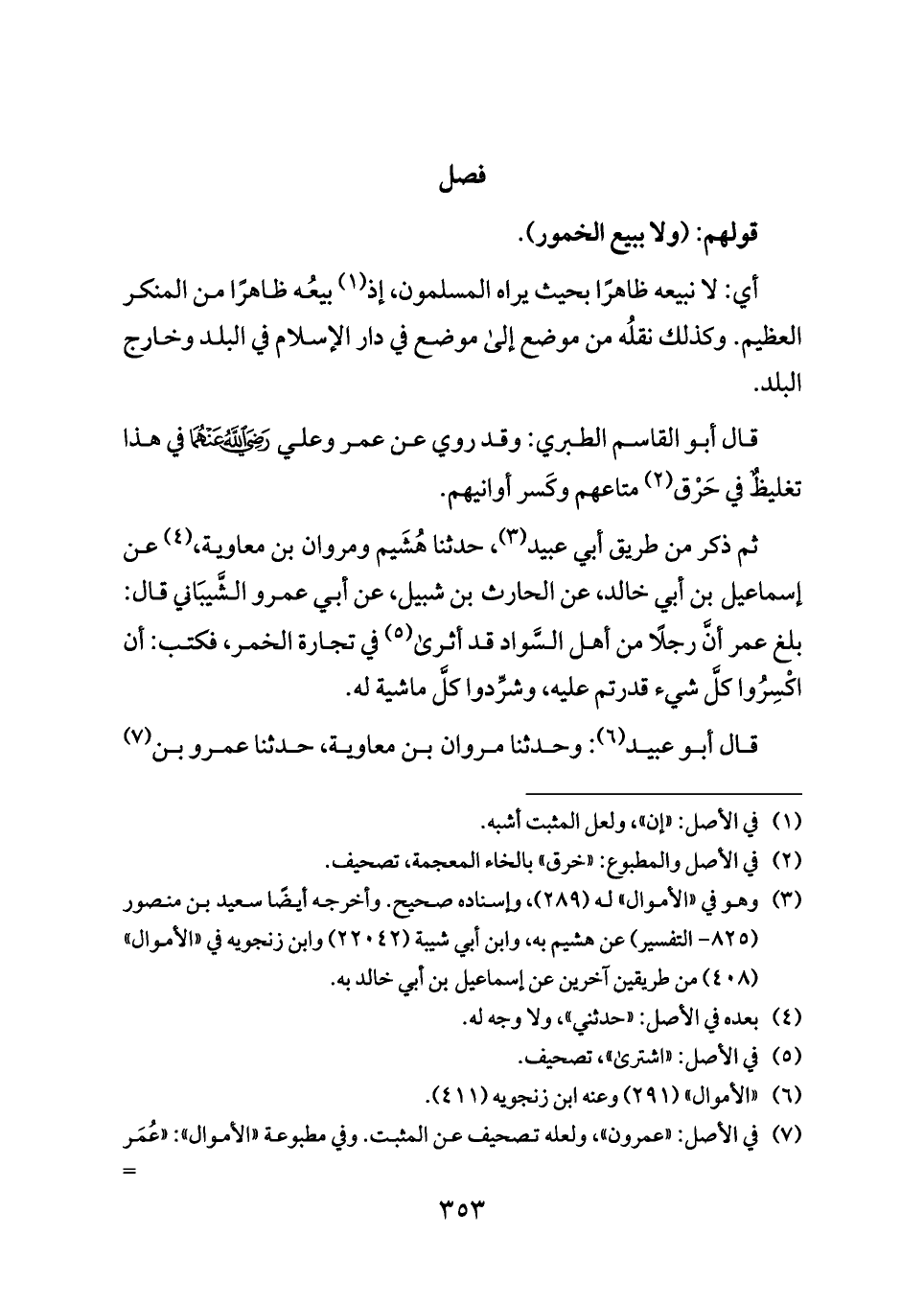 ثم ذكر من طريق أبي عبيد (¬٣)، حدثنا هُشَيم ومروان بن معاوية، (¬٤) عن إسماعيل بن أبي خالد، عن الحارث بن شبيل، عن أبي عمرو الشَّيبَاني قال: بلغ عمر أنَّ رجلًا من أهل السَّواد قد أثرى (¬٥) في تجارة الخمر، فكتب: أن اكْسِرُوا كلَّ شيء قدرتم عليه، وشرِّدوا كلَّ ماشية له.