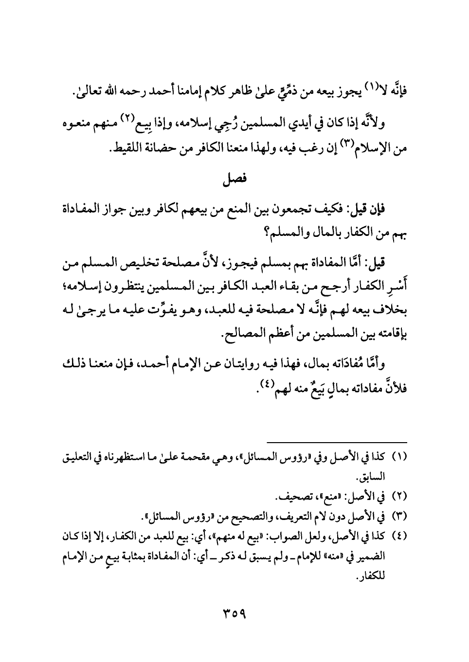 وأمَّا مُفادَاته بمال، فهذا فيه روايتان عن الإمام أحمد، فإن منعنا ذلك فلأنَّ مفاداته بمالٍ بَيعٌ منه لهم (¬٤).