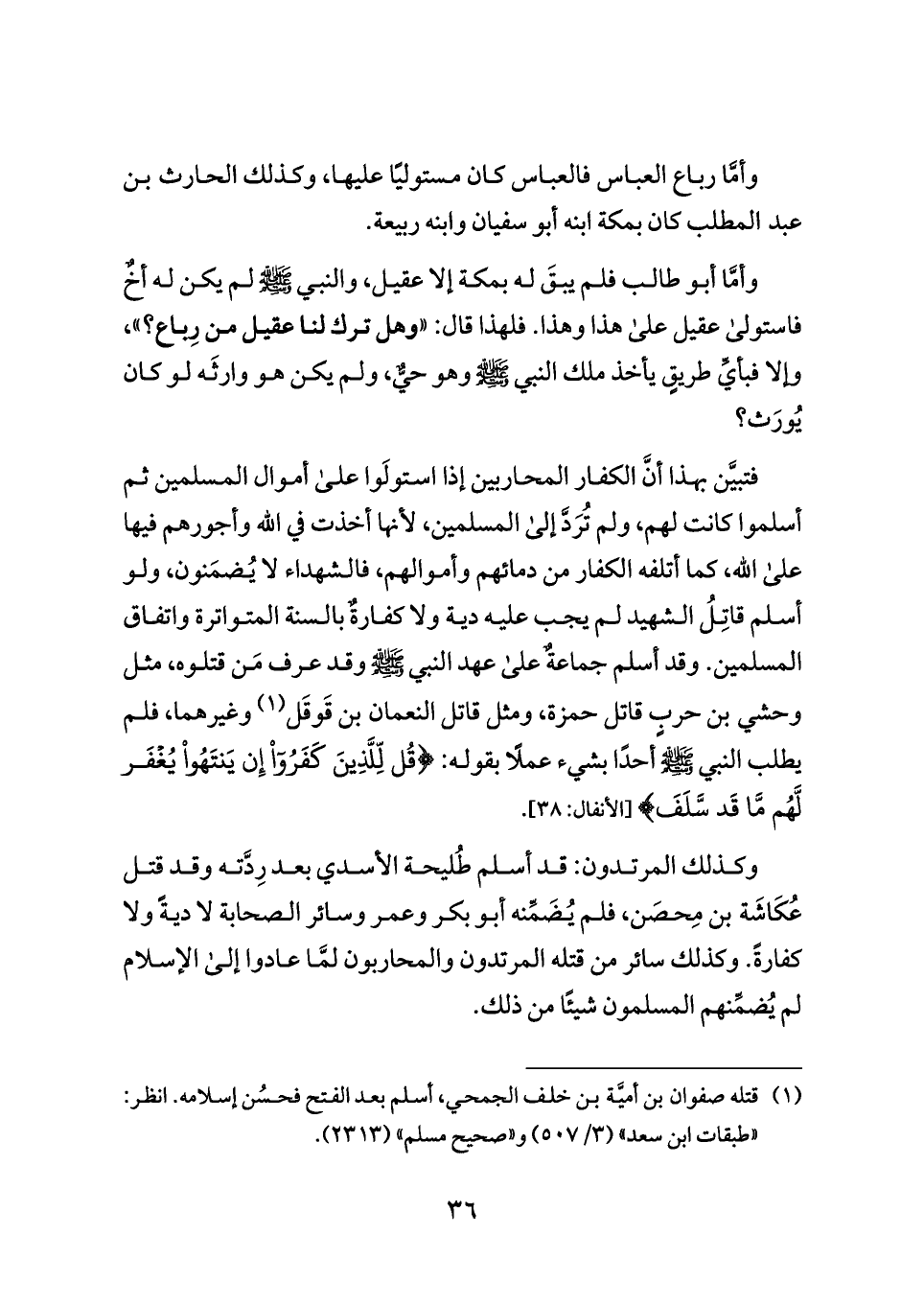 فتبيَّن بهذا أنَّ الكفار المحاربين إذا استولَوا على أموال المسلمين ثم أسلموا كانت لهم، ولم تُرَدَّ إلى المسلمين، لأنها أخذت في الله وأجورهم فيها على الله، كما أتلفه الكفار من دمائهم وأموالهم، فالشهداء لا يُضمَنون، ولو أسلم قاتِلُ الشهيد لم يجب عليه دية ولا كفارةٌ بالسنة المتواترة واتفاق المسلمين. وقد أسلم جماعةٌ على عهد النبي - صلى الله عليه وسلم - وقد عرف مَن قتلوه، مثل وحشي بن حربٍ قاتل حمزة، ومثل قاتل النعمان بن قَوقَل (¬١) وغيرهما، فلم يطلب النبي - صلى الله عليه وسلم - أحدًا بشيء عملًا بقوله: {قُل لِّلَّذِينَ كَفَرُوا إِن يَنتَهُوا يُغْفَر لَّهُم مَّا قَد سَّلَفَ} [الأنفال: ٣٨].