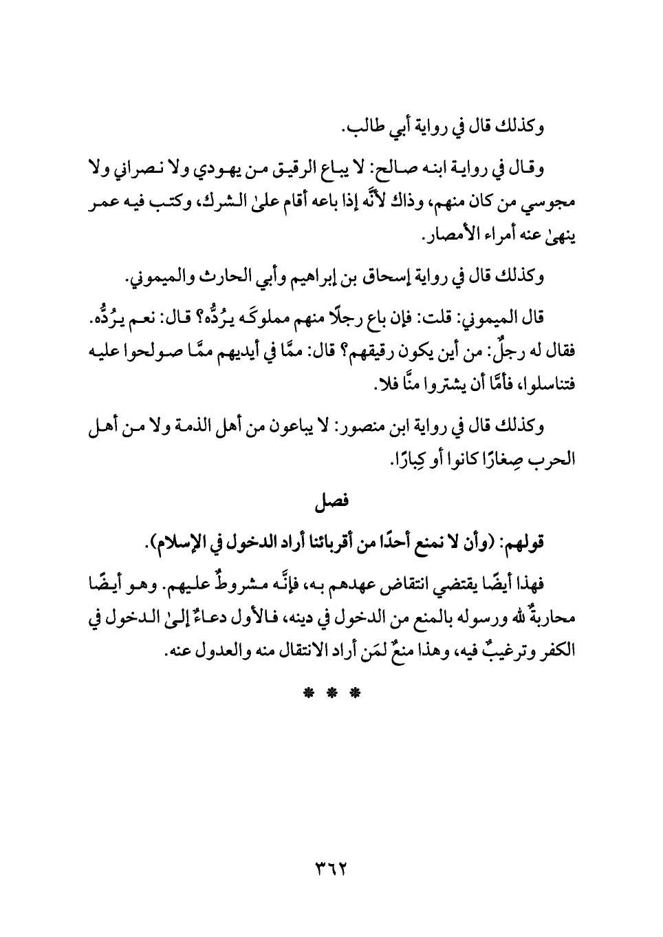 وقال في رواية ابنه صالح: لا يباع الرقيق من يهودي ولا نصراني ولا مجوسي من كان منهم، وذاك لأنَّه إذا باعه أقام على الشرك، وكتب فيه عمر ينهى عنه أمراء الأمصار.