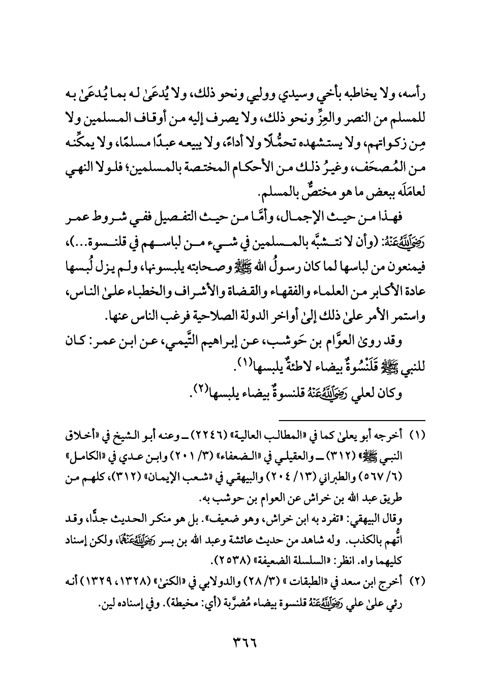 فهذا من حيث الإجمال، وأمَّا من حيث التفصيل ففي شروط عمر - رضي الله عنه -: (وأن لا نتشبَّه بالمسلمين في شيء من لباسهم في قلنسوة ... )، فيمنعون من لباسها لما كان رسولُ الله - صلى الله عليه وسلم - وصحابته يلبسونها، ولم يزل لُبسها عادة الأكابر من العلماء والفقهاء والقضاة والأشراف والخطباء على الناس، واستمر الأمر على ذلك إلى أواخر الدولة الصلاحية فرغب الناس عنها.