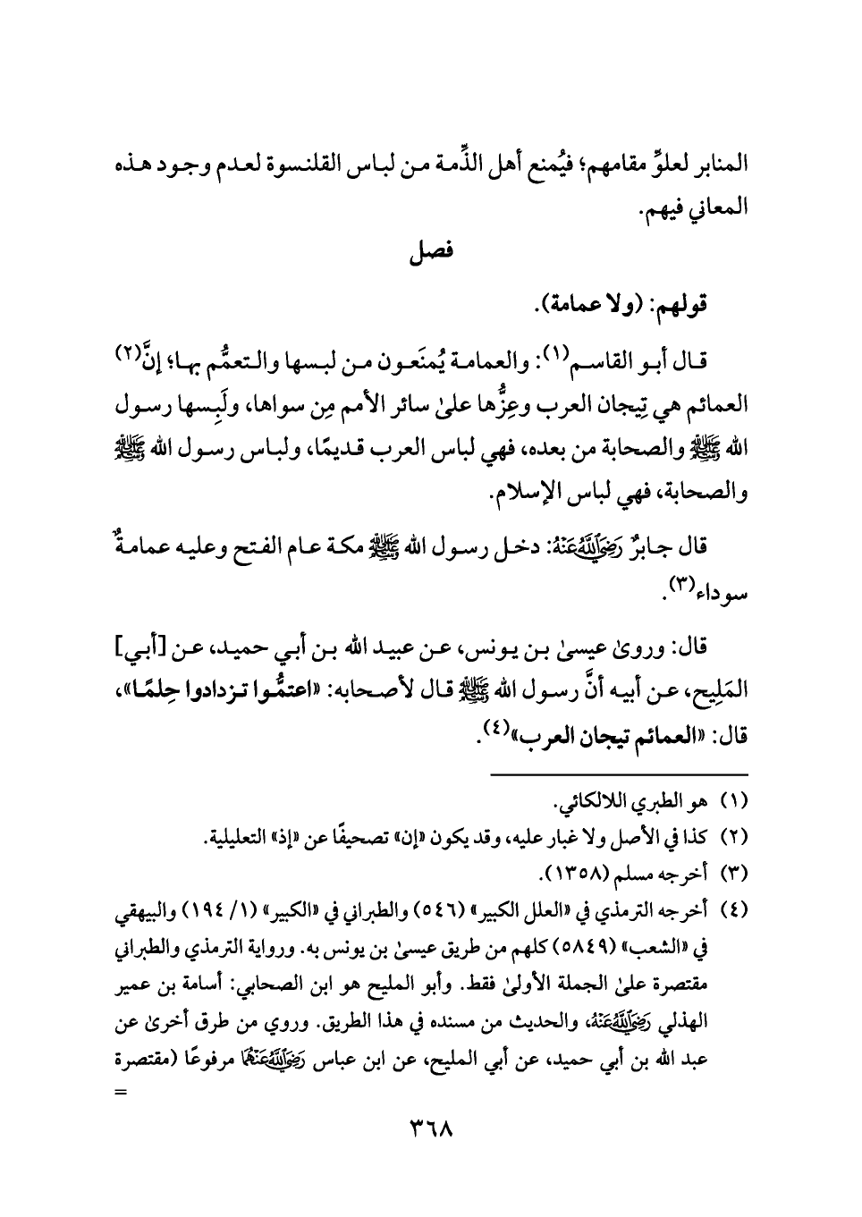 قال: وروى عيسى بن يونس، عن عبيد الله بن أبي حميد، عن [أبي] المَلِيح، عن أبيه أنَّ رسول الله - صلى الله عليه وسلم - قال لأصحابه: «اعتمُّوا تزدادوا حِلمًا»، قال: «العمائم تيجان العرب» (¬٤).