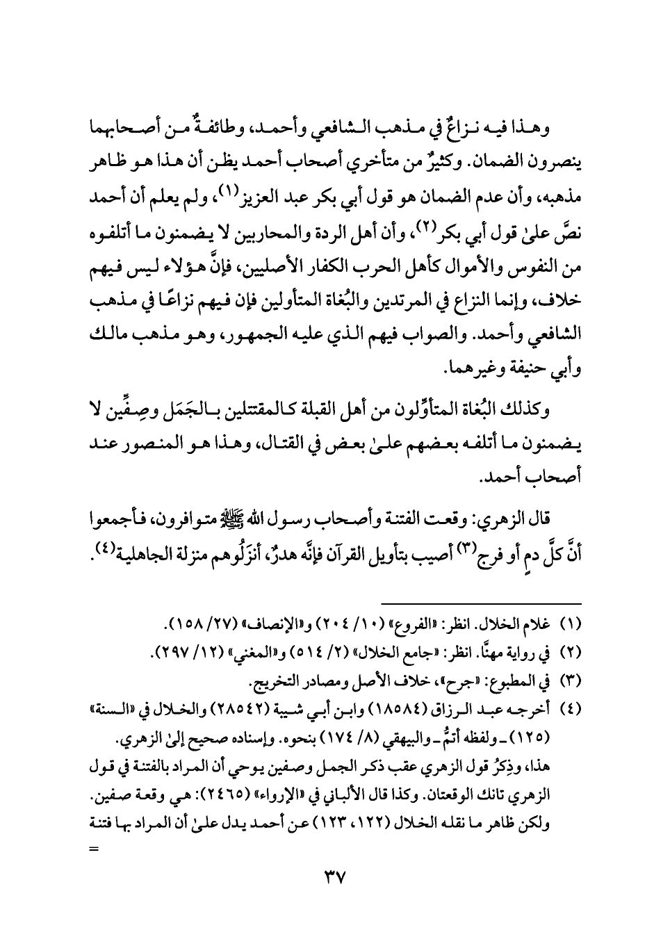 هذا، وذِكرُ قول الزهري عقب ذكر الجمل وصفين يوحي أن المراد بالفتنة في قول الزهري تانك الوقعتان. وكذا قال الألباني في «الإرواء» (٢٤٦٥): هي وقعة صفين. ولكن ظاهر ما نقله الخلال (١٢٢، ١٢٣) عن أحمد يدل على أن المراد بها فتنة الخوارج والحرورية. وهو الصواب، فإن المقتتلين بالجمل وصفين لم يستحلُّوا الفروج بخلاف الخوارج. والله أعلم.