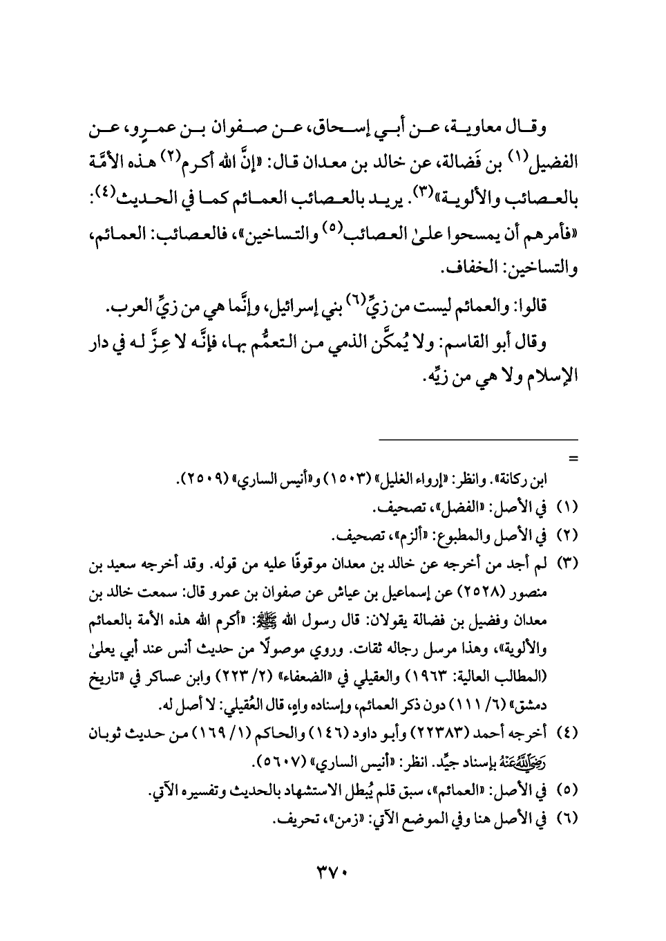 وقال معاوية، عن أبي إسحاق، عن صفوان بن عمرٍو، عن الفضيل (¬١) بن فَضالة، عن خالد بن معدان قال: «إنَّ الله أكرم (¬٢) هذه الأمَّة بالعصائب والألوية» (¬٣). يريد بالعصائب العمائم كما في الحديث (¬٤): «فأمرهم أن يمسحوا على العصائب (¬٥) والتساخين»، فالعصائب: العمائم، والتساخين: الخفاف.