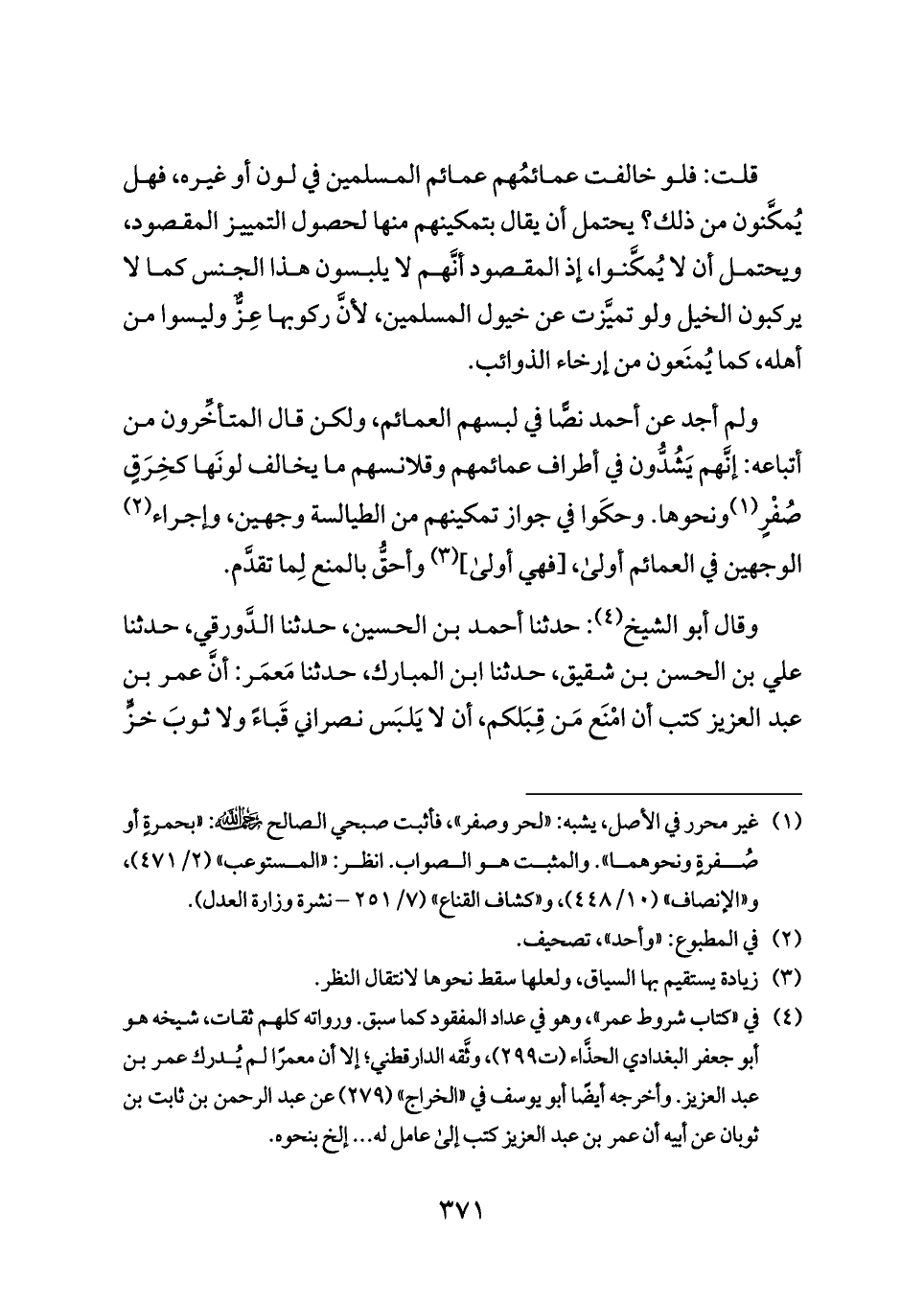 ولم أجد عن أحمد نصًّا في لبسهم العمائم، ولكن قال المتأخِّرون من أتباعه: إنَّهم يَشُدُّون في أطراف عمائمهم وقلانسهم ما يخالف لونَها كخِرَقٍ صُفْرٍ (¬١) ونحوها. وحكَوا في جواز تمكينهم من الطيالسة وجهين، وإجراء (¬٢) الوجهين في العمائم أولى، [فهي أولى] (¬٣) وأحقُّ بالمنع لِما تقدَّم.