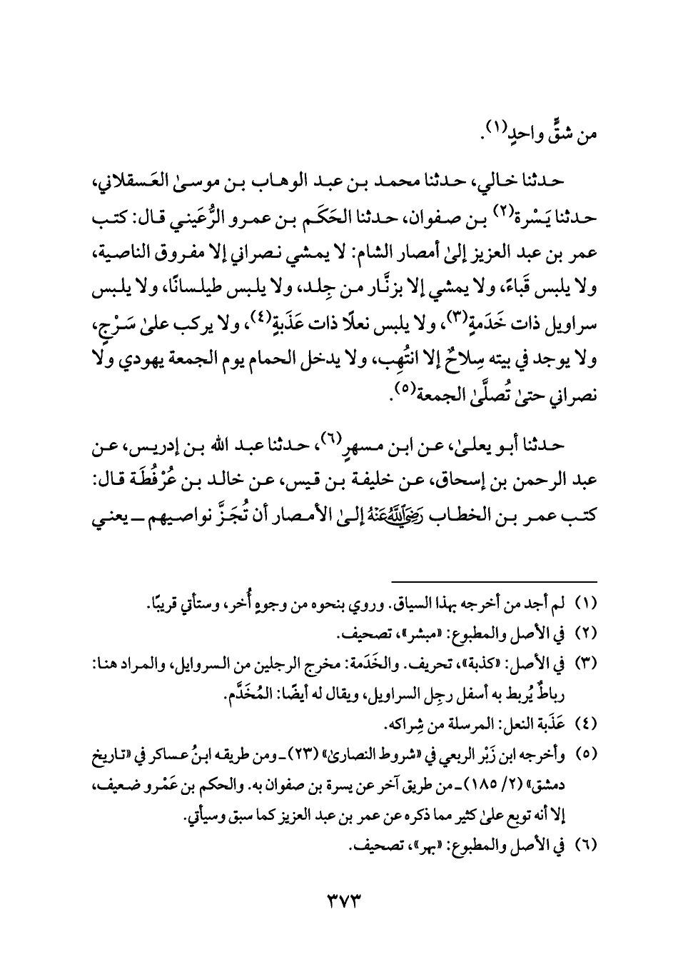 حدثنا خالي، حدثنا محمد بن عبد الوهاب بن موسى العَسقلاني، حدثنا يَسْرة (¬٢) بن صفوان، حدثنا الحَكَم بن عمرو الرُّعَيني قال: كتب عمر بن عبد العزيز إلى أمصار الشام: لا يمشي نصراني إلا مفروق الناصية، ولا يلبس قَباءً، ولا يمشي إلا بزنَّار من جِلد، ولا يلبس طيلسانًا، ولا يلبس سراويل ذات خَدَمةٍ (¬٣)، ولا يلبس نعلًا ذات عَذَبةٍ (¬٤)، ولا يركب على سَرْجٍ، ولا يوجد في بيته سِلاحٌ إلا انتُهِب، ولا يدخل الحمام يوم الجمعة يهودي ولا نصراني حتى تُصلَّى الجمعة (¬٥).