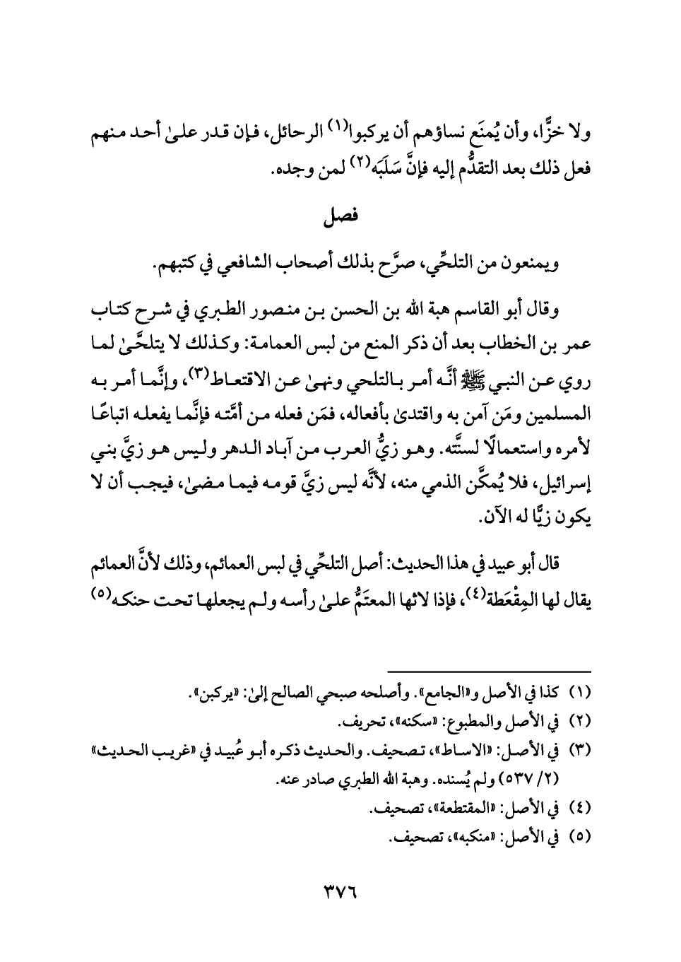 وقال أبو القاسم هبة الله بن الحسن بن منصور الطبري في شرح كتاب عمر بن الخطاب بعد أن ذكر المنع من لبس العمامة: وكذلك لا يتلحَّى لما روي عن النبي - صلى الله عليه وسلم - أنَّه أمر بالتلحي ونهى عن الاقتعاط (¬٣)، وإنَّما أمر به المسلمين ومَن آمن به واقتدى بأفعاله، فمَن فعله من أمَّته فإنَّما يفعله اتباعًا لأمره واستعمالًا لسنَّته. وهو زيُّ العرب من آباد الدهر وليس هو زيَّ بني إسرائيل، فلا يُمكَّن الذمي منه، لأنَّه ليس زيَّ قومه فيما مضى، فيجب أن لا يكون زيًّا له الآن.