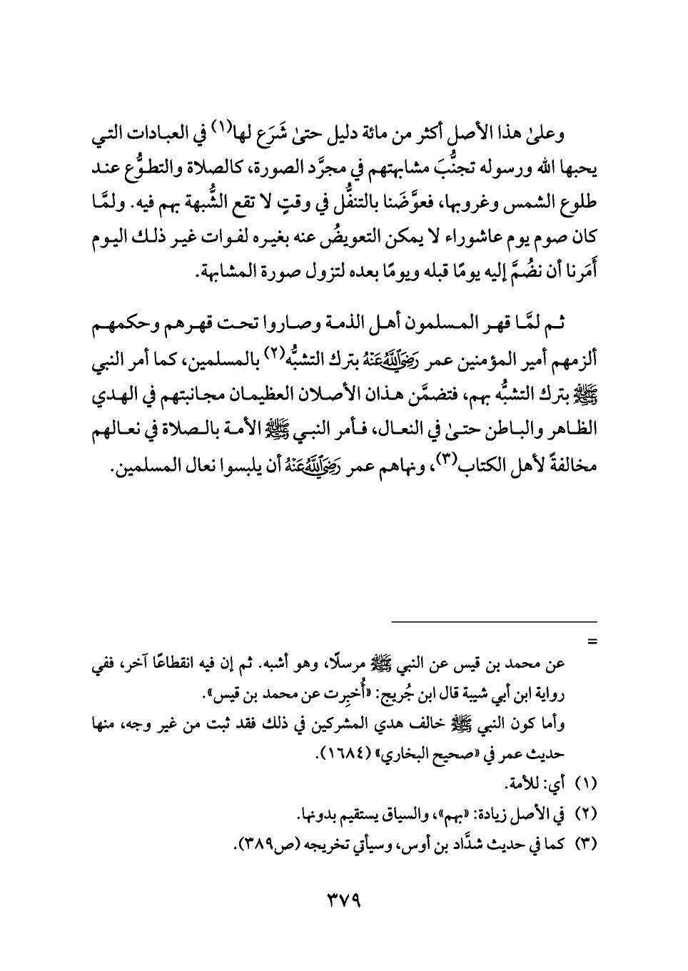 ثم لمَّا قهر المسلمون أهل الذمة وصاروا تحت قهرهم وحكمهم ألزمهم أمير المؤمنين عمر - رضي الله عنه - بترك التشبُّه (¬٢) بالمسلمين، كما أمر النبي - صلى الله عليه وسلم - بترك التشبُّه بهم، فتضمَّن هذان الأصلان العظيمان مجانبتهم في الهدي الظاهر والباطن حتى في النعال، فأمر النبي - صلى الله عليه وسلم - الأمة بالصلاة في نعالهم مخالفةً لأهل الكتاب (¬٣)، ونهاهم عمر - رضي الله عنه - أن يلبسوا نعال المسلمين.