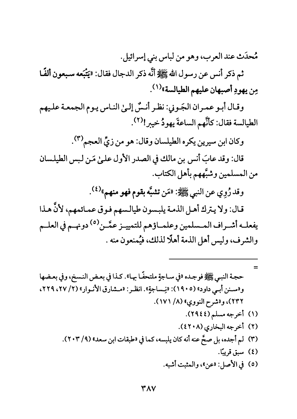 قال: وقد عابَ أنس بن مالك في الصدر الأول على مَن لبس الطيلسان من المسلمين وشبَّههم بأهل الكتاب.