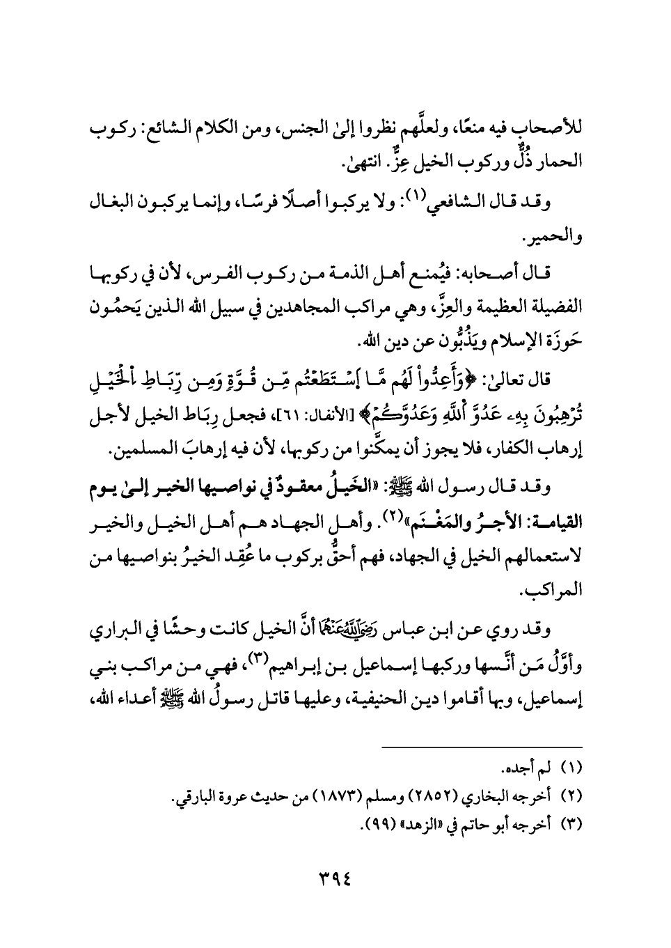 وقد قال رسول الله - صلى الله عليه وسلم -: «الخَيلُ معقودٌ في نواصيها الخير إلى يوم القيامة: الأجرُ والمَغْنَم» (¬٢). وأهل الجهاد هم أهل الخيل والخير لاستعمالهم الخيل في الجهاد، فهم أحقُّ بركوب ما عُقِد الخيرُ بنواصيها من المراكب.