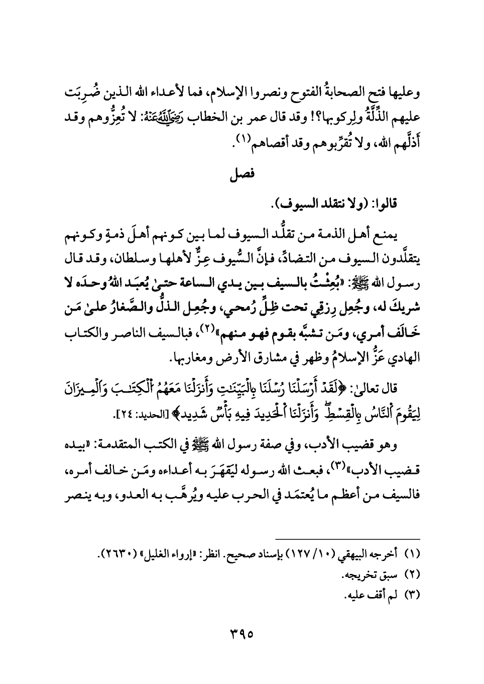 يمنع أهل الذمة من تقلُّد السيوف لما بين كونهم أهلَ ذمةٍ وكونهم يتقلَّدون السيوف من التضادِّ، فإنَّ السُّيوف عِزٌّ لأهلها وسلطان، وقد قال رسول الله - صلى الله عليه وسلم -: «بُعِثْتُ بالسيف بين يدي الساعة حتى يُعبَد اللهُ وحدَه لا شريكَ له، وجُعِل رِزقِي تحت ظِلِّ رُمحي، وجُعِل الذلُّ والصَّغارُ على مَن خَالَف أمري، ومَن تشبَّه بقوم فهو منهم» (¬٢)، فبالسيف الناصر والكتاب الهادي عَزُّ الإسلامُ وظهر في مشارق الأرض ومغاربها.