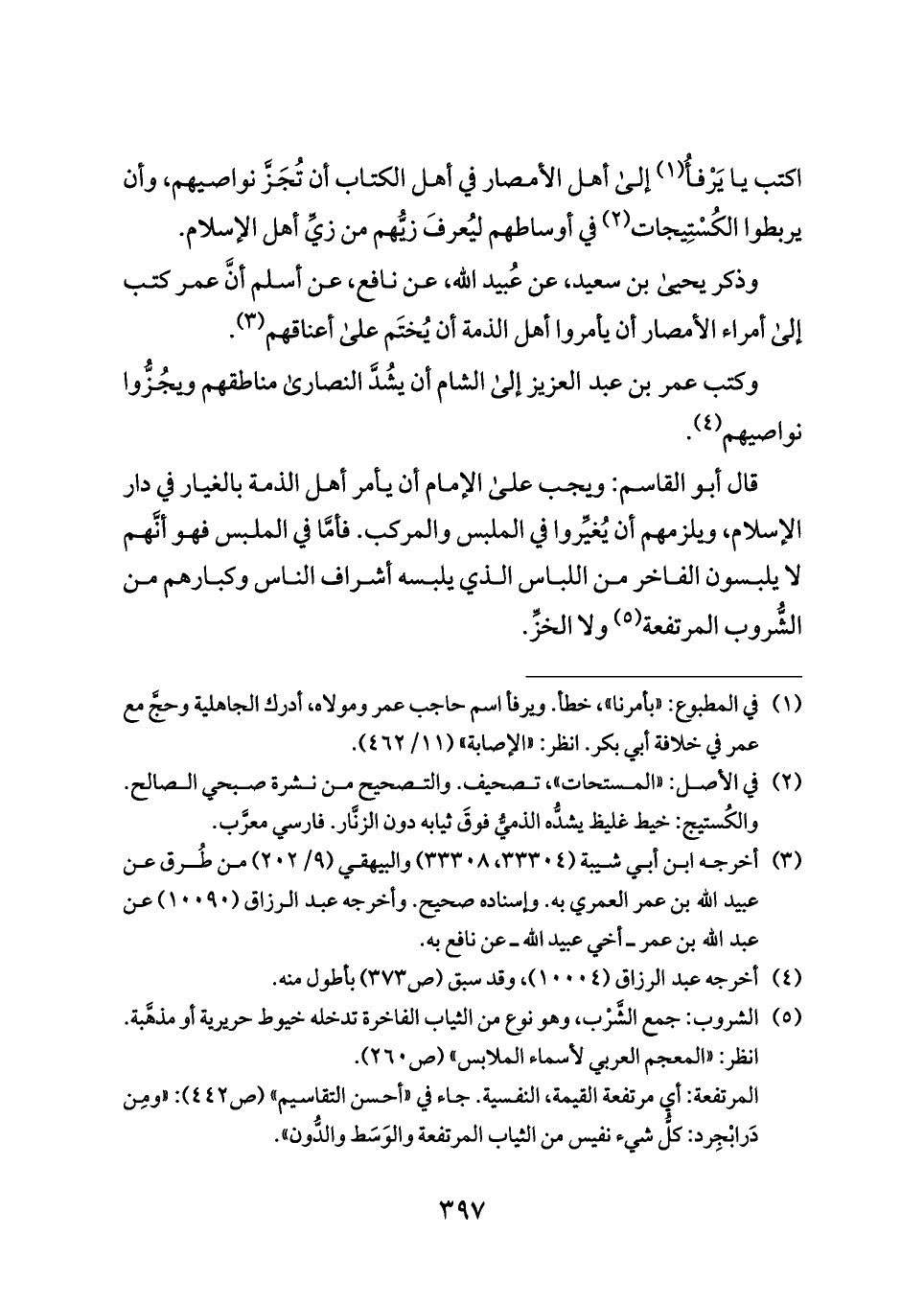 (¬٢) في الأصل: «المستحات»، تصحيف. والتصحيح من نشرة صبحي الصالح. والكُستيج: خيط غليظ يشدُّه الذميُّ فوقَ ثيابه دون الزنَّار. فارسي معرَّب.