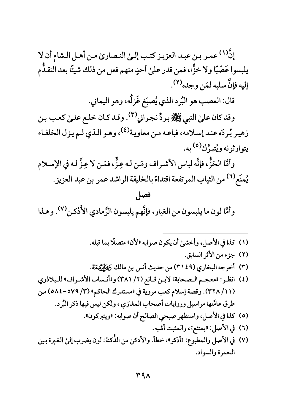 إنَّ (¬١) عمر بن عبد العزيز كتب إلى النصارى من أهل الشام أن لا يلبسوا عَصْبًا ولا خزًّا، فمن قدر على أحدٍ منهم فعل من ذلك شيئًا بعد التقدُّم إليه فإنَّ سلبه لمَن وجده (¬٢).