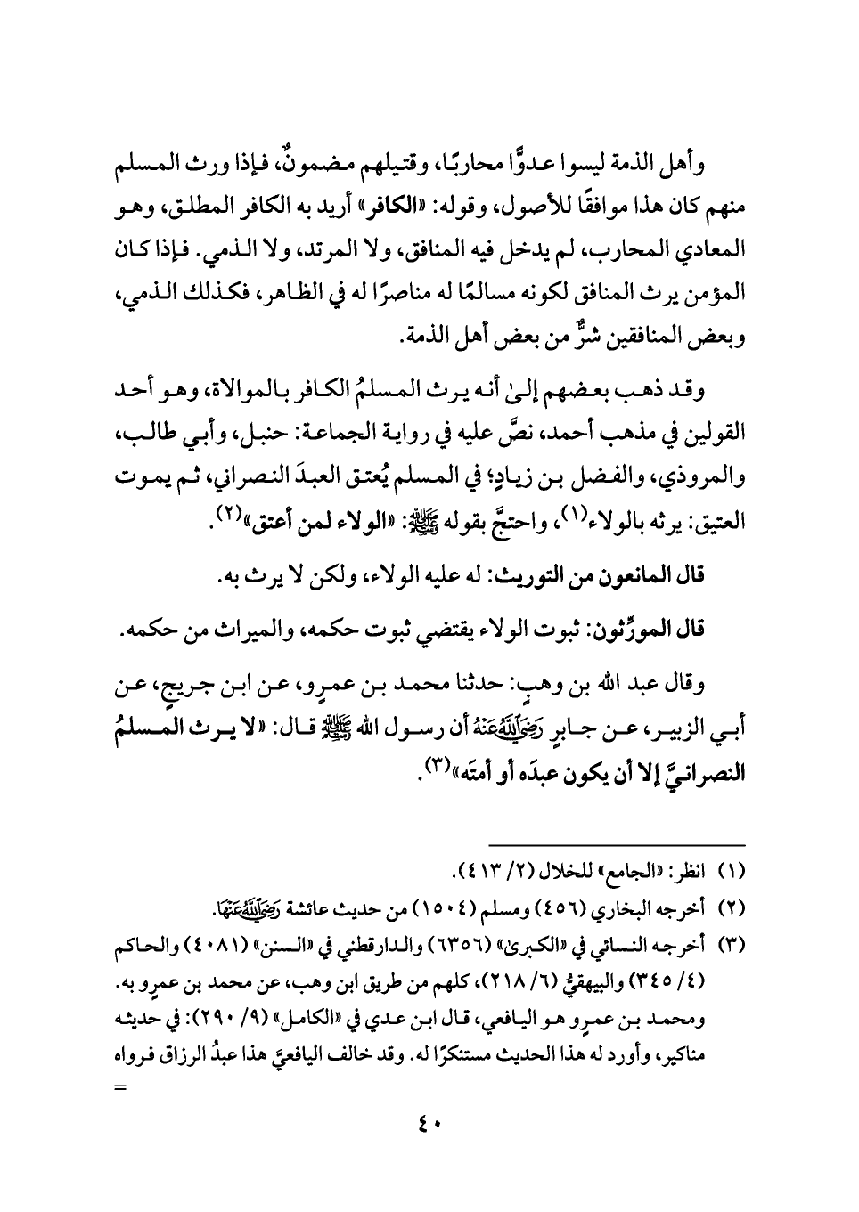 وأهل الذمة ليسوا عدوًّا محاربًا، وقتيلهم مضمونٌ، فإذا ورث المسلم منهم كان هذا موافقًا للأصول، وقوله: «الكافر» أريد به الكافر المطلق، وهو المعادي المحارب، لم يدخل فيه المنافق، ولا المرتد، ولا الذمي. فإذا كان المؤمن يرث المنافق لكونه مسالمًا له مناصرًا له في الظاهر، فكذلك الذمي، وبعض المنافقين شرٌّ من بعض أهل الذمة.