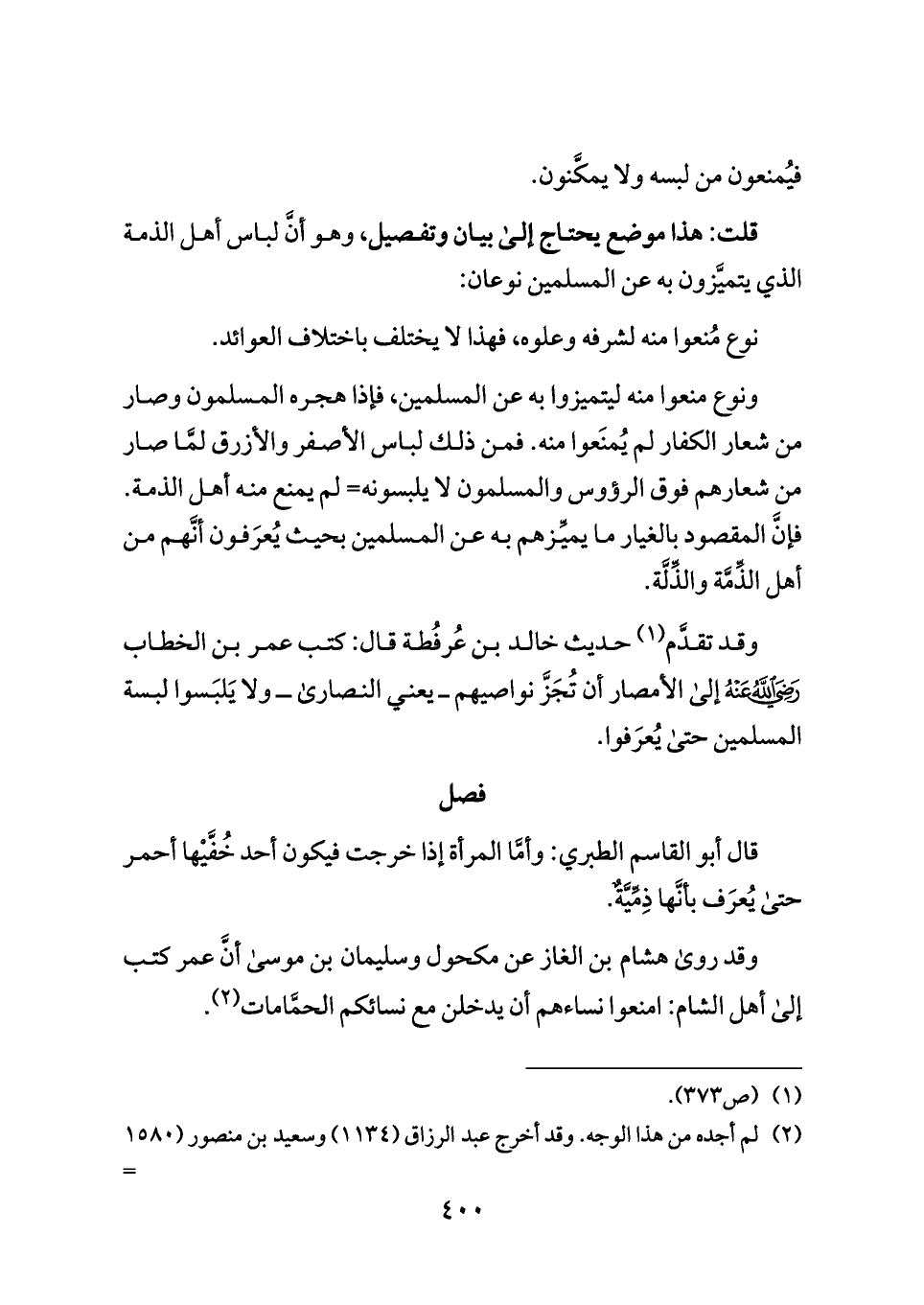 قلت: هذا موضع يحتاج إلى بيان وتفصيل، وهو أنَّ لباس أهل الذمة الذي يتميَّزون به عن المسلمين نوعان: