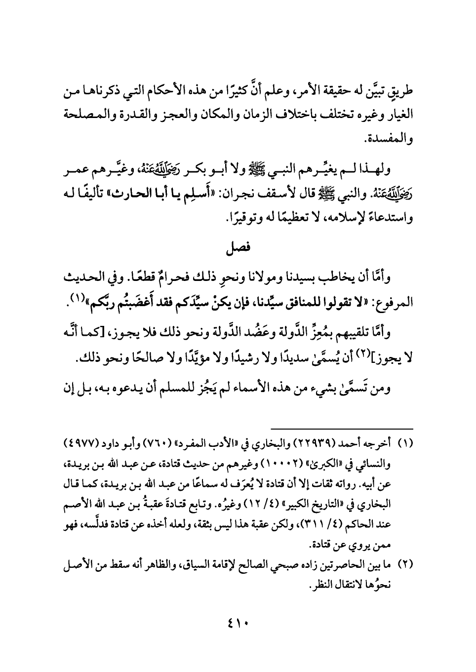 وأمَّا أن يخاطب بسيدنا ومولانا ونحوِ ذلك فحرامٌ قطعًا. وفي الحديث المرفوع: «لا تقولوا للمنافق سيِّدنا، فإن يكنْ سيِّدَكم فقد أَغضَبتُم ربَّكم» (¬١).