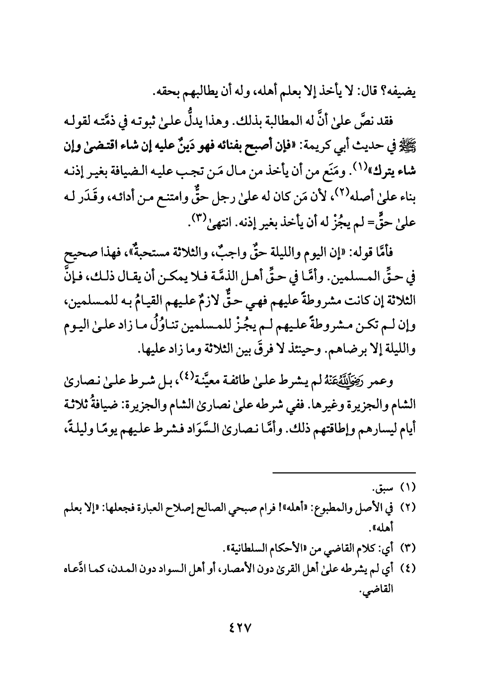 فأمَّا قوله: «إن اليوم والليلة حقٌ واجبٌ، والثلاثة مستحبةٌ»، فهذا صحيح في حقِّ المسلمين. وأمَّا في حقِّ أهل الذمَّة فلا يمكن أن يقال ذلك، فإنَّ الثلاثة إن كانت مشروطةً عليهم فهي حقٌّ لازمٌ عليهم القيامُ به للمسلمين، وإن لم تكن مشروطةً عليهم لم يجُزْ للمسلمين تناوُلُ ما زاد على اليوم والليلة إلا برضاهم. وحينئذ لا فرقَ بين الثلاثة وما زاد عليها.