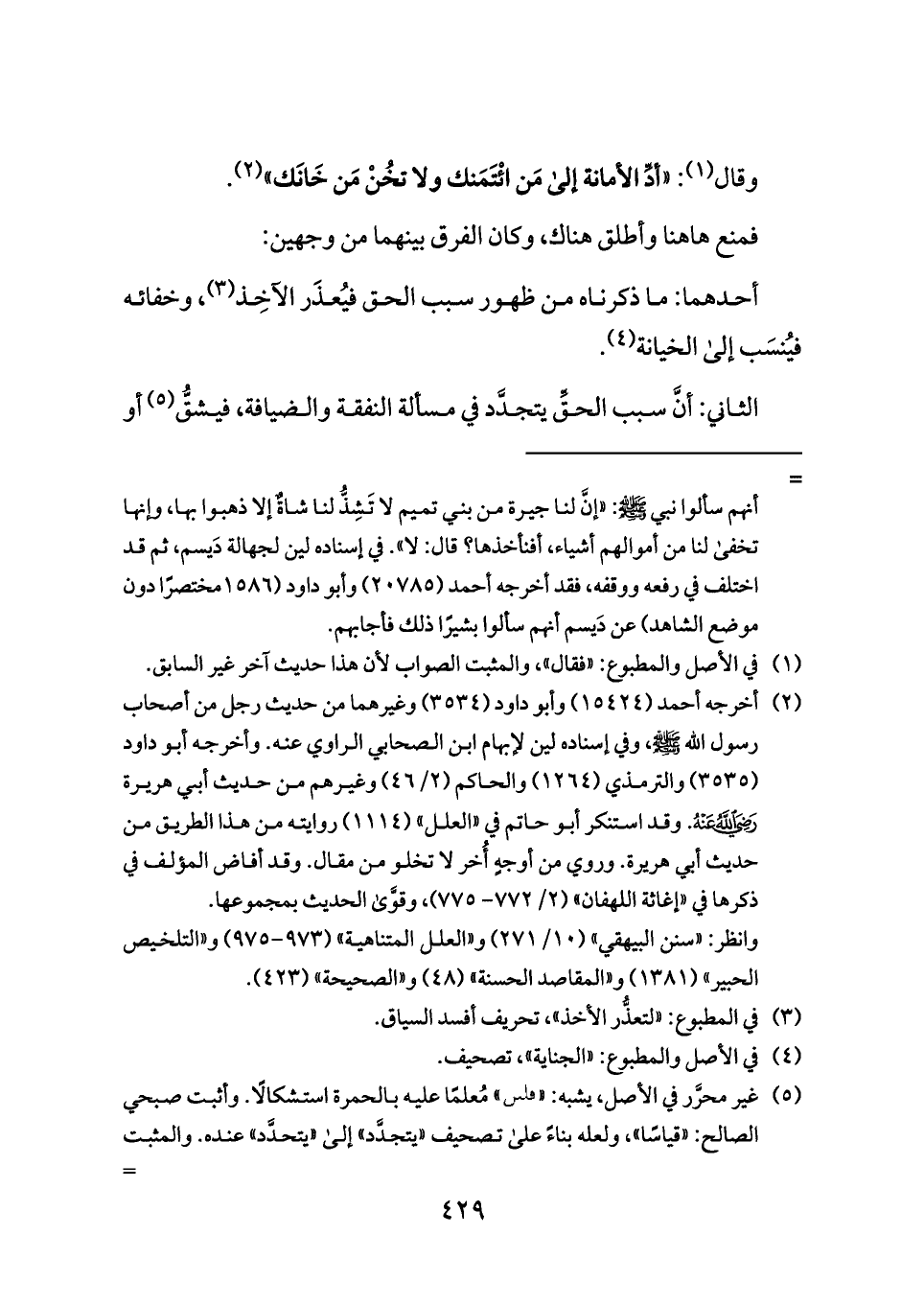 أحدهما: ما ذكرناه من ظهور سبب الحق فيُعذَر الآخِذ (¬٣)، وخفائه فيُنسَب إلى الخيانة (¬٤).