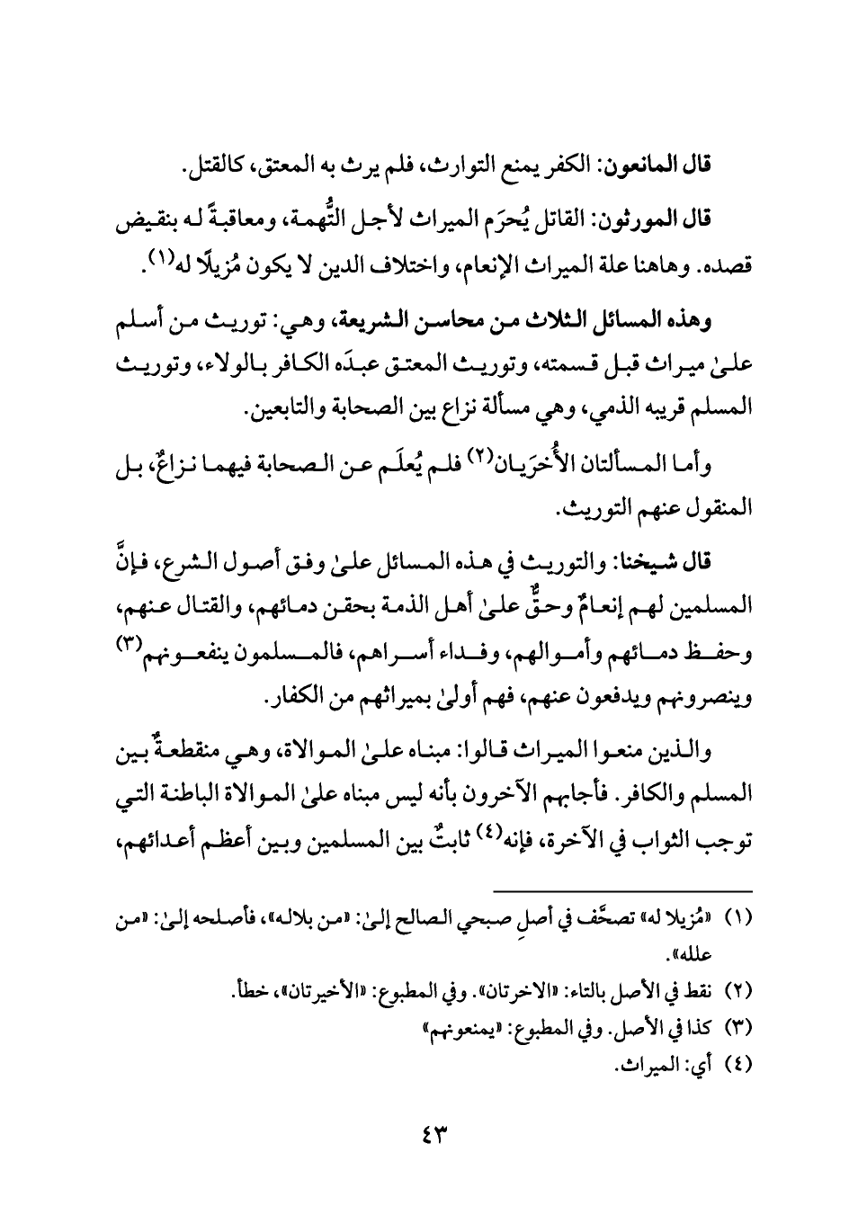 وهذه المسائل الثلاث من محاسن الشريعة، وهي: توريث من أسلم على ميراث قبل قسمته، وتوريث المعتق عبدَه الكافر بالولاء، وتوريث المسلم قريبه الذمي، وهي مسألة نزاع بين الصحابة والتابعين.