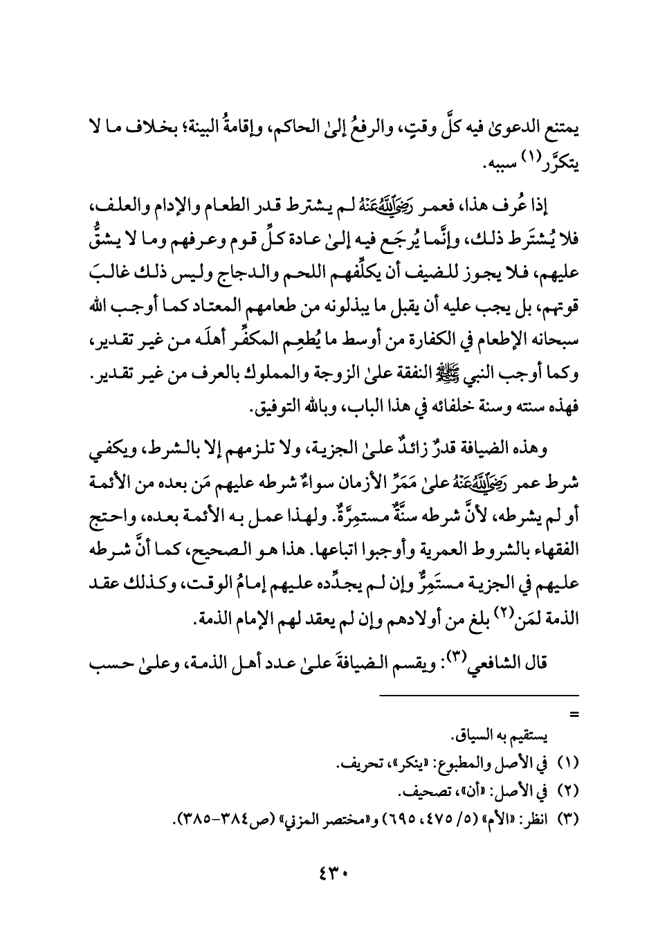 وهذه الضيافة قدرٌ زائدٌ على الجزية، ولا تلزمهم إلا بالشرط، ويكفي شرط عمر - رضي الله عنه - على مَمَرِّ الأزمان سواءٌ شرطه عليهم مَن بعده من الأئمة أو لم يشرطه، لأنَّ شرطه سنَّةٌ مستمِرَّةٌ. ولهذا عمل به الأئمة بعده، واحتج الفقهاء بالشروط العمرية وأوجبوا اتباعها. هذا هو الصحيح، كما أنَّ شرطه عليهم في الجزية مستَمِرٌّ وإن لم يجدِّده عليهم إمامُ الوقت، وكذلك عقد الذمة لمَن (¬٢) بلغ من أولادهم وإن لم يعقد لهم الإمام الذمة.