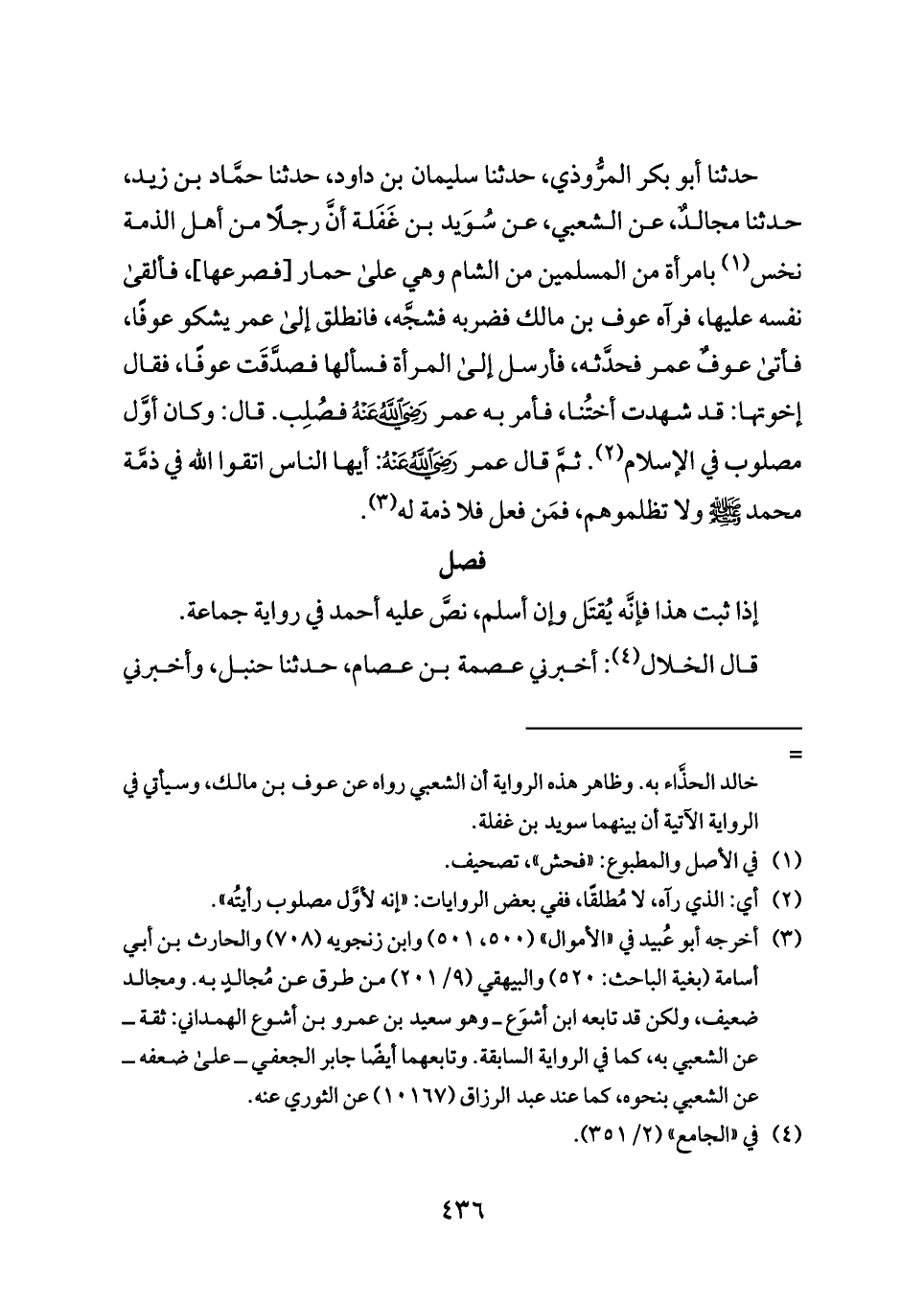 حدثنا أبو بكر المرُّوذي، حدثنا سليمان بن داود، حدثنا حمَّاد بن زيد، حدثنا مجالدٌ، عن الشعبي، عن سُوَيد بن غَفَلة أنَّ رجلًا من أهل الذمة نخس (¬١) بامرأة من المسلمين من الشام وهي على حمار [فصرعها]، فألقى نفسه عليها، فرآه عوف بن مالك فضربه فشجَّه، فانطلق إلى عمر يشكو عوفًا، فأتى عوفٌ عمر فحدَّثه، فأرسل إلى المرأة فسألها فصدَّقَت عوفًا، فقال إخوتها: قد شهدت أختُنا، فأمر به عمر - رضي الله عنه - فصُلِب. قال: وكان أوَّل مصلوب في الإسلام (¬٢). ثمَّ قال عمر - رضي الله عنه -: أيها الناس اتقوا الله في ذمَّة محمد - صلى الله عليه وسلم - ولا تظلموهم، فمَن فعل فلا ذمة له (¬٣).