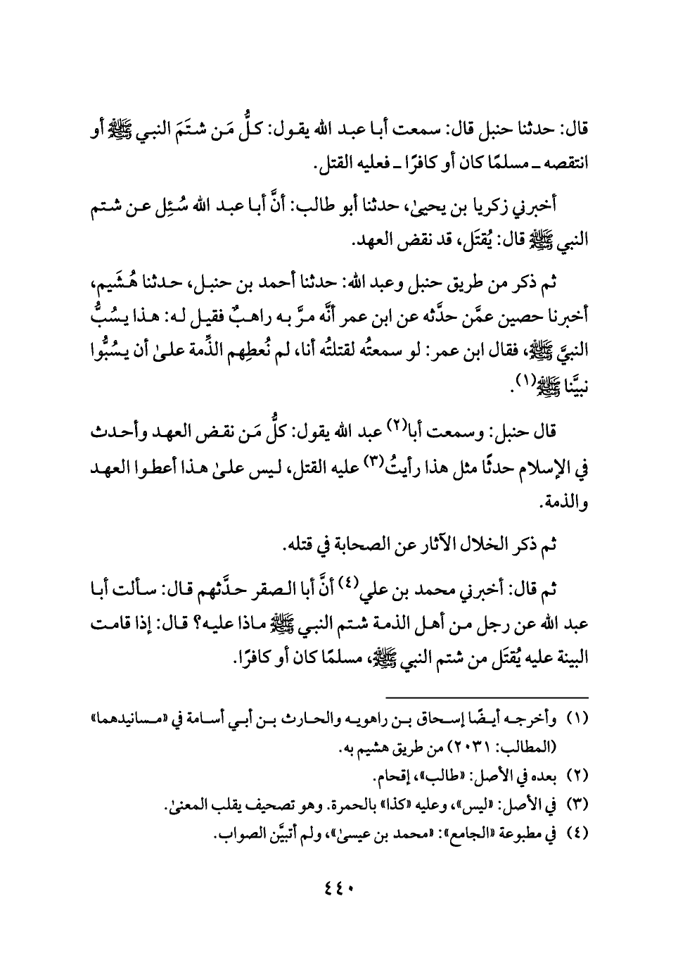 أخبرني زكريا بن يحيى، حدثنا أبو طالب: أنَّ أبا عبد الله سُئِل عن شتم النبي - صلى الله عليه وسلم - قال: يُقتَل، قد نقض العهد.