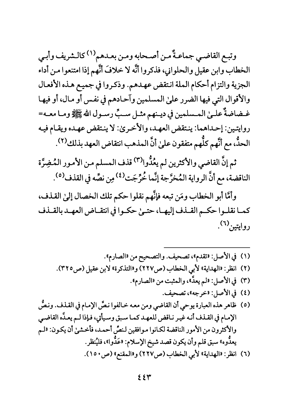 (¬٥) ظاهر هذه العبارة يوحي أن القاضي ومن معه خالفوا نصَّ الإمام في القذف. ونصُّ الإمام في القذف أنه غير ناقض للعهد كما سبق وسيأتي، فإذا لم يعدَّه القاضي والأكثرون من الأمور الناقضة لكانوا موافقين لنصِّ أحمد، فأخشى أن يكون: «لم يعدُّوه» سبق قلم وأن يكون قصد شيخ الإسلام: «عَدُّوا»، فليُنظر.