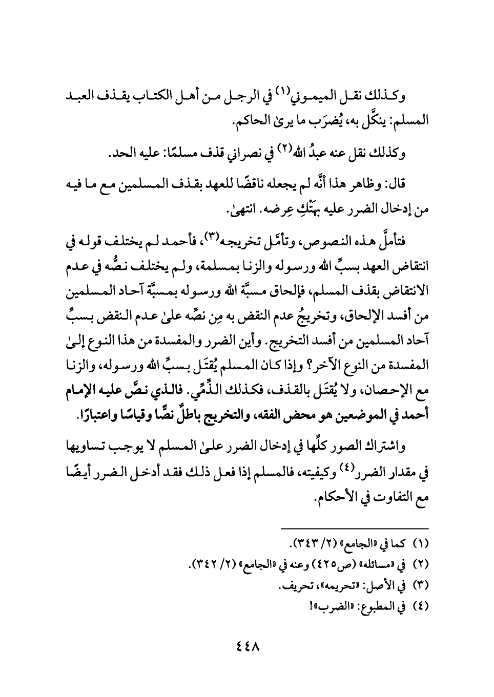 فتأملَّ هذه النصوص، وتأمَّل تخريجه (¬٣)، فأحمد لم يختلف قوله في انتقاض العهد بسبِّ الله ورسوله والزنا بمسلمة، ولم يختلف نصُّه في عدم الانتقاض بقذف المسلم، فإلحاق مسبَّة الله ورسوله بمسبَّة آحاد المسلمين من أفسد الإلحاق، وتخريجُ عدم النقض به مِن نصِّه على عدم النقض بسبِّ آحاد المسلمين من أفسد التخريج. وأين الضرر والمفسدة من هذا النوع إلى المفسدة من النوع الآخر؟ وإذا كان المسلم يُقتَل بسبِّ الله ورسوله، والزنا مع الإحصان، ولا يُقتَل بالقذف، فكذلك الذِّمِّي. فالذي نصَّ عليه الإمام أحمد في الموضعين هو محض الفقه، والتخريج باطلٌ نصًّا وقياسًا واعتبارًا.