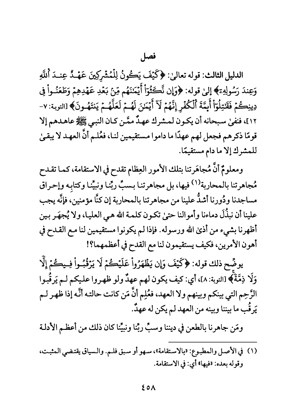 الدليل الثالث: قوله تعالى: {كَيْفَ يَكُونُ لِلْمُشْرِكِينَ عَهْدٌ عِندَ اَللَّهِ وَعِندَ رَسُولِهِ} إلى قوله: {وَإِن نَّكَثُوا أَيْمَانَهُم مِّن بَعْدِ عَهْدِهِمْ وَطَعَنُوا فِي دِينِكُمْ فَقَاتِلُوا أَئمَّةَ اَلْكُفْرِ إِنَّهُمْ لَا أَيْمَانَ لَهُمْ لَعَلَّهُمْ يَنتَهُونَ} [التوبة: ٧ - ١٢]، فنفى سبحانه أن يكون لمشرك عهدٌ ممَّن كان النبي - صلى الله عليه وسلم - عاهدهم إلا قومًا ذكرهم فجعل لهم عهدًا ما داموا مستقيمين لنا، فعُلم أنَّ العهد لا يبقى للمشرك إلا ما دام مستقيمًا.
