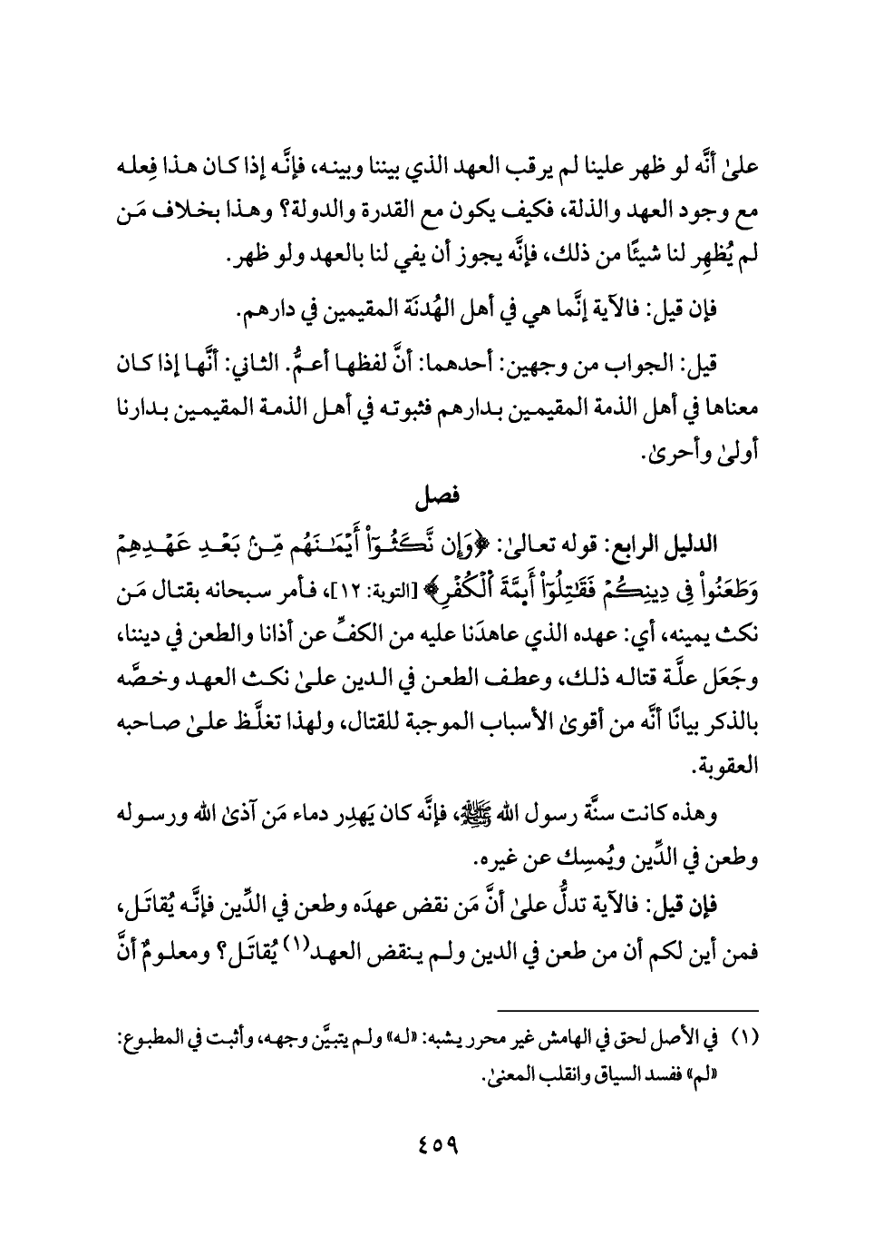 الدليل الرابع: قوله تعالى: {وَإِن نَّكَثُوا أَيْمَانَهُم مِّن بَعْدِ عَهْدِهِمْ وَطَعَنُوا فِي دِينِكُمْ فَقَاتِلُوا أَئمَّةَ اَلْكُفْرِ} [التوبة: ١٢]، فأمر سبحانه بقتال مَن نكث يمينه، أي: عهده الذي عاهدَنا عليه من الكفِّ عن أذانا والطعن في ديننا، وجَعَل علَّة قتاله ذلك، وعطف الطعن في الدين على نكث العهد وخصَّه بالذكر بيانًا أنَّه من أقوى الأسباب الموجبة للقتال، ولهذا تغلَّظ على صاحبه العقوبة.